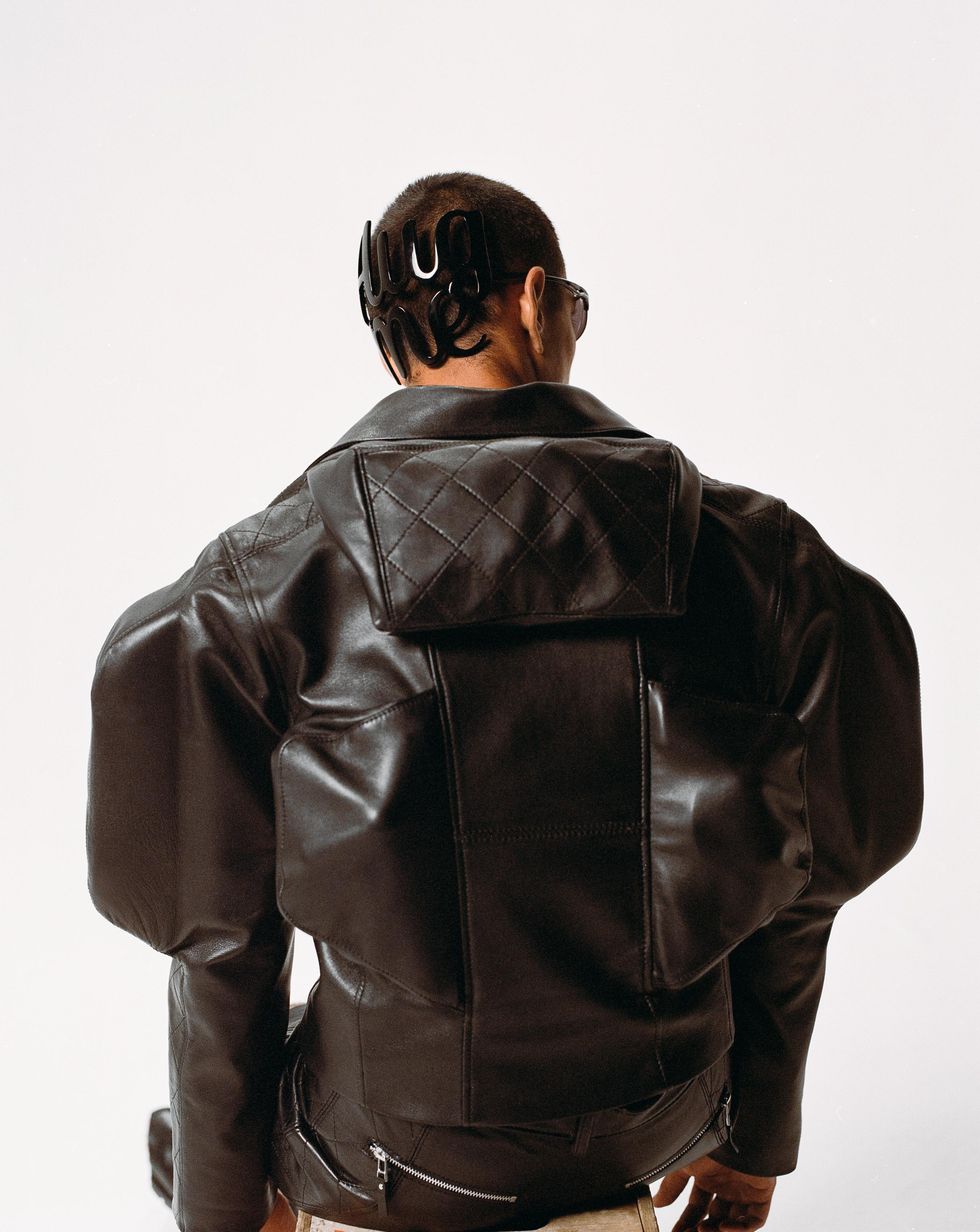 Another look in the collection is called "hug me." It's a leather jacket inspired by the traditional biker jacket. I thought a lot about the senses and feelings activated by hugs and how to create a “mechanical hug.” Hugging the person wearing the jacket activates massage machines that are located inside the jacket's back. I wanted to create a situation that is self-interested to an extent: a hug for a massage.