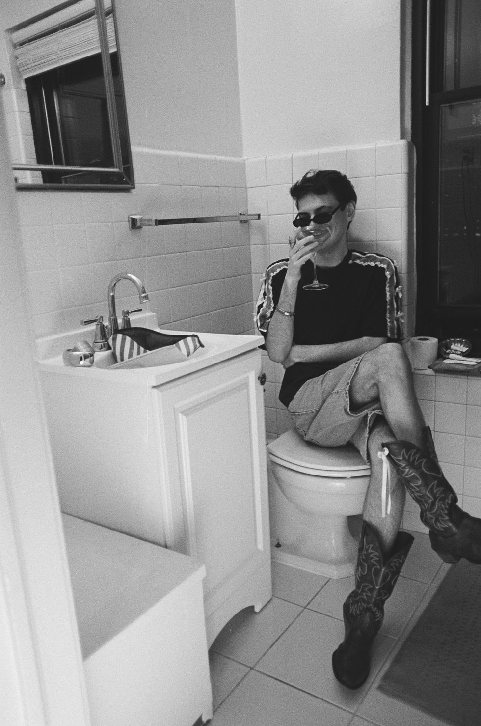 Behind the chaos and giggles, though, is a methodological approach. “I film in my bathroom because I love the lighting there. It’s not too harsh, not too dark: balanced,” he shares, speaking with the seriousness of an auteur. “My favorite thing is to go through Pinterest and look up ‘early 2000s living rooms’ … Choosing the background is really where the art form lies. Plus, putting on retail music,” he says, his eyes lighting up. “It’s a very Albert Einstein formula.”