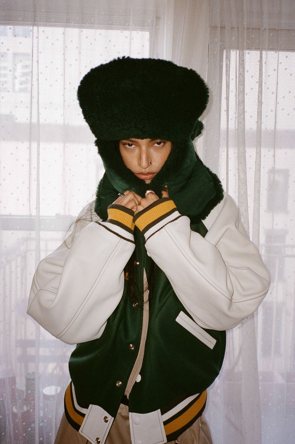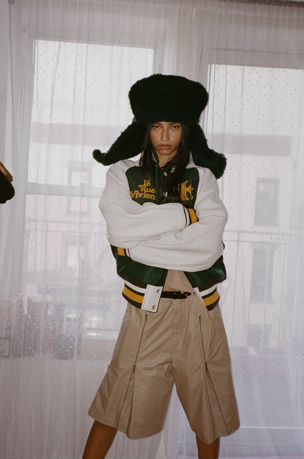Hat: Burberry, Bomber: Kenzo, available at essxnyc.com, Top and shorts: Iceberg, Belt: Ami Paris, Rings: Eli Burch
