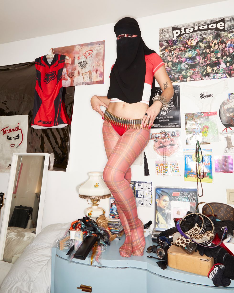 I speak Farsi. Both of my parents are from Iran and I was raised Muslim. I spent all of my summers growing up in Iran. And in some ways, I was raised between Iran and Cleveland, which are like super extreme opposites. Similar in a way too, though. Persian culture is richly poetic and beautiful, and it's a culture of revolutionaries in a sense. We don’t like to follow rules, which is ironic considering the current regime. But with the current regime, there’s this oppressive aspect to the way that religion is imposed or integrated into the culture, right? It’s an Islamic Republic. There’s mandatory hijab for women, there are restrictions on how men and women can interact in public. I think there’s a difference between the spiritual manifestation of religion and the institutional application. I resonate with the former, totally, but exploring the latter has also been a feature of my work. So in my imagery, for example, I’ll wear the headpiece of a niqab along with a really skimpy outfit. And maybe that's very haram and some people would consider that blasphemous, but for me–