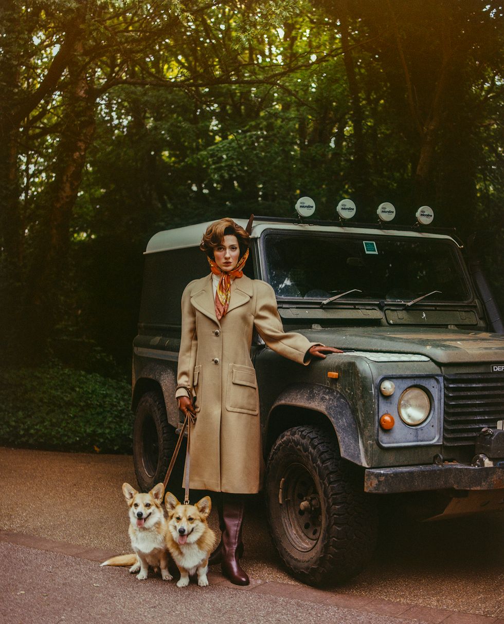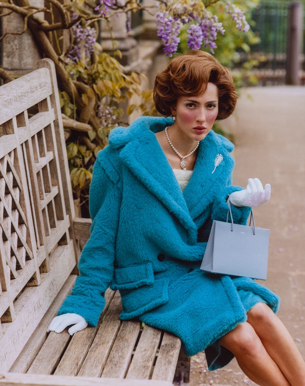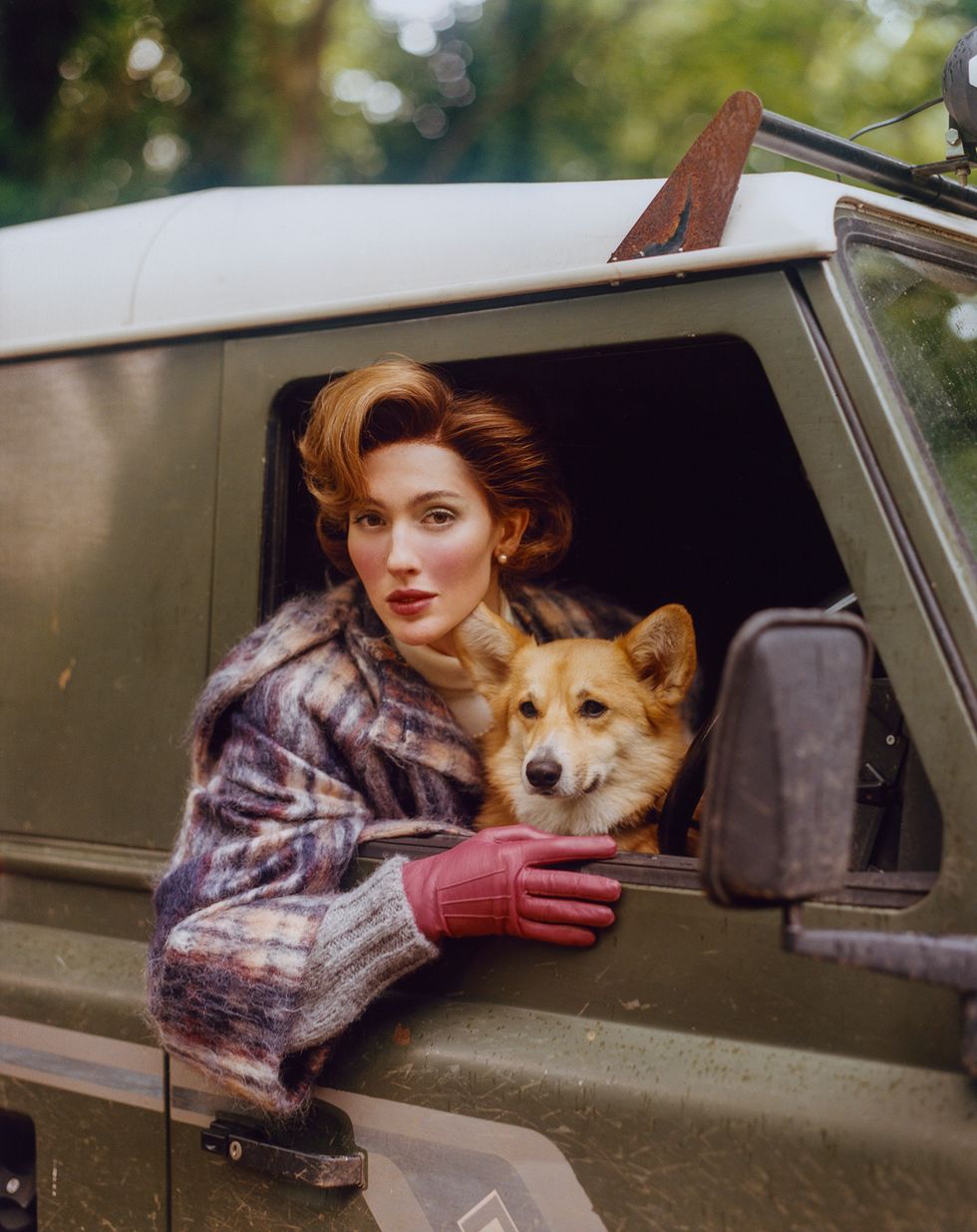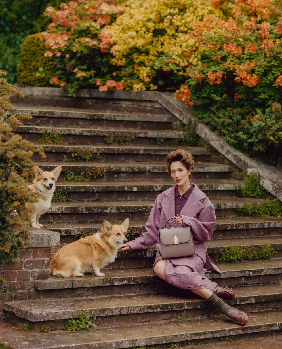 Jacket and skirt: Andreas Kronthaler for Vivienne Westwood, Sweater: Rokit Vintage, Bag: Salvatore Ferragamo, Socks: Mulberry, Shoes: By Far