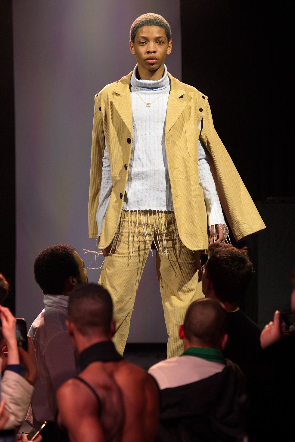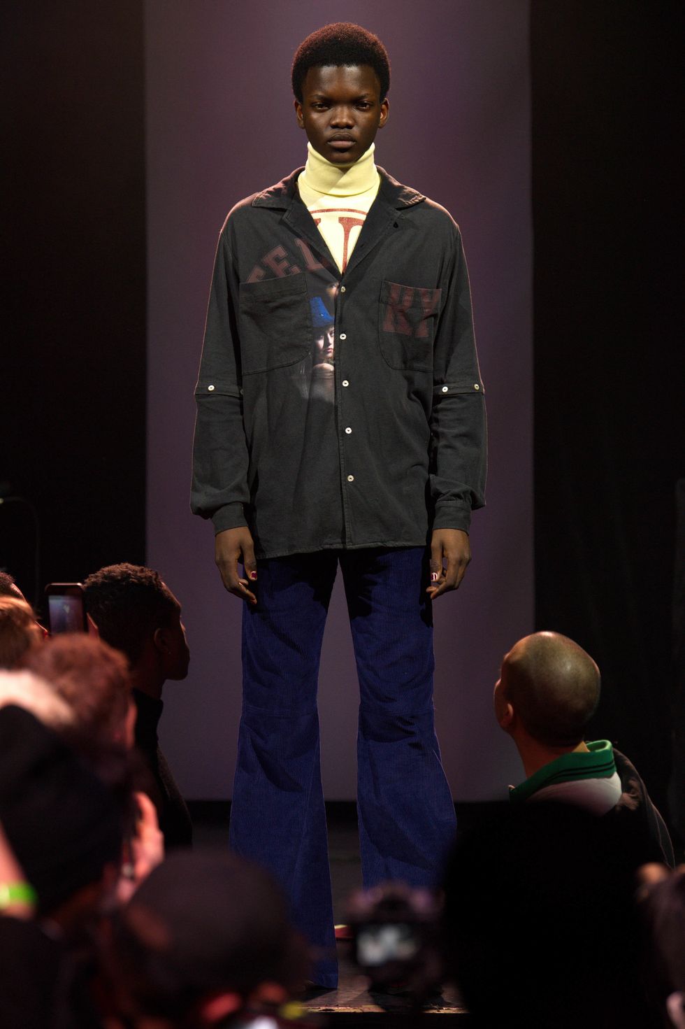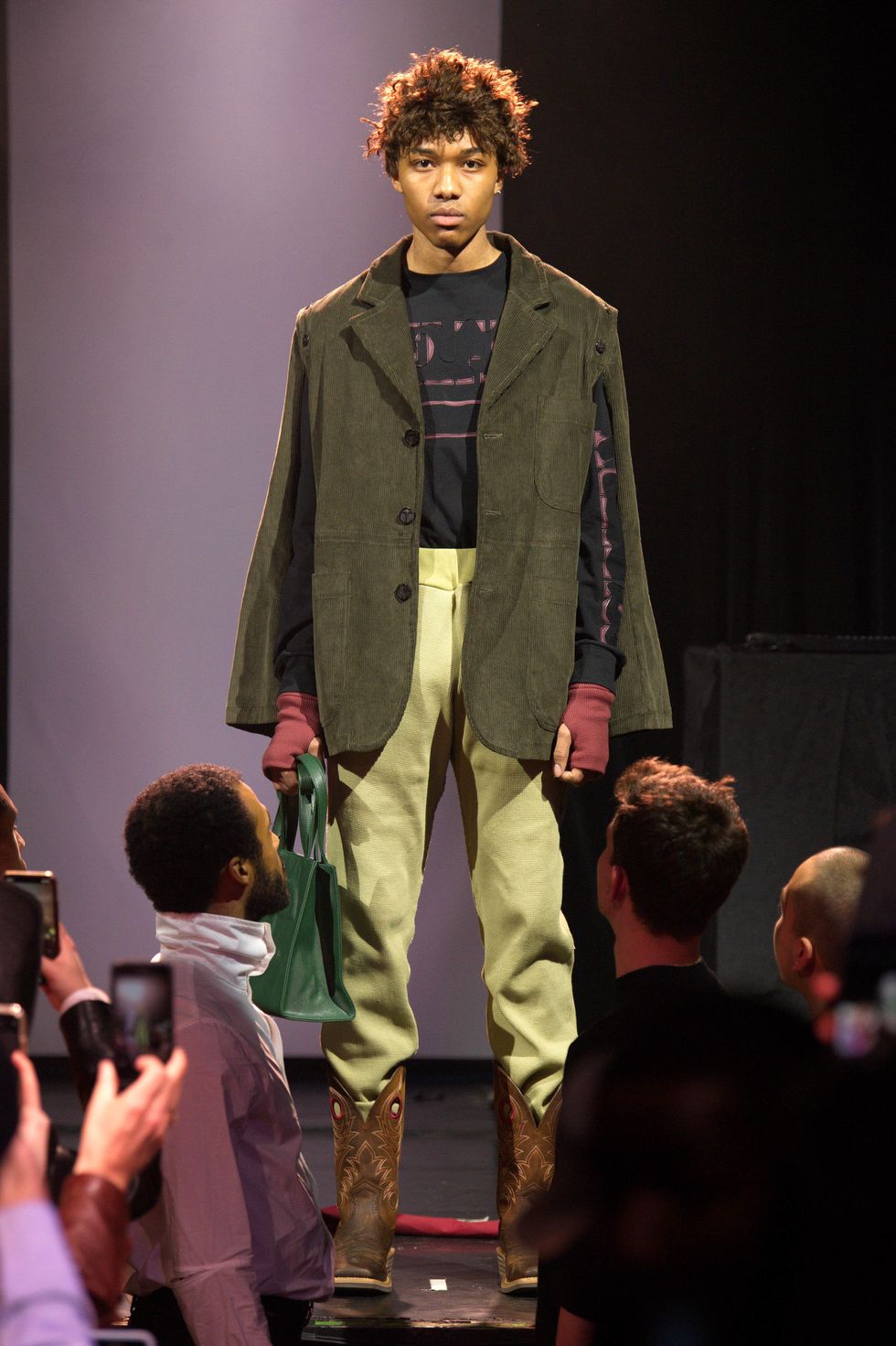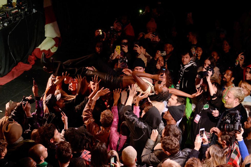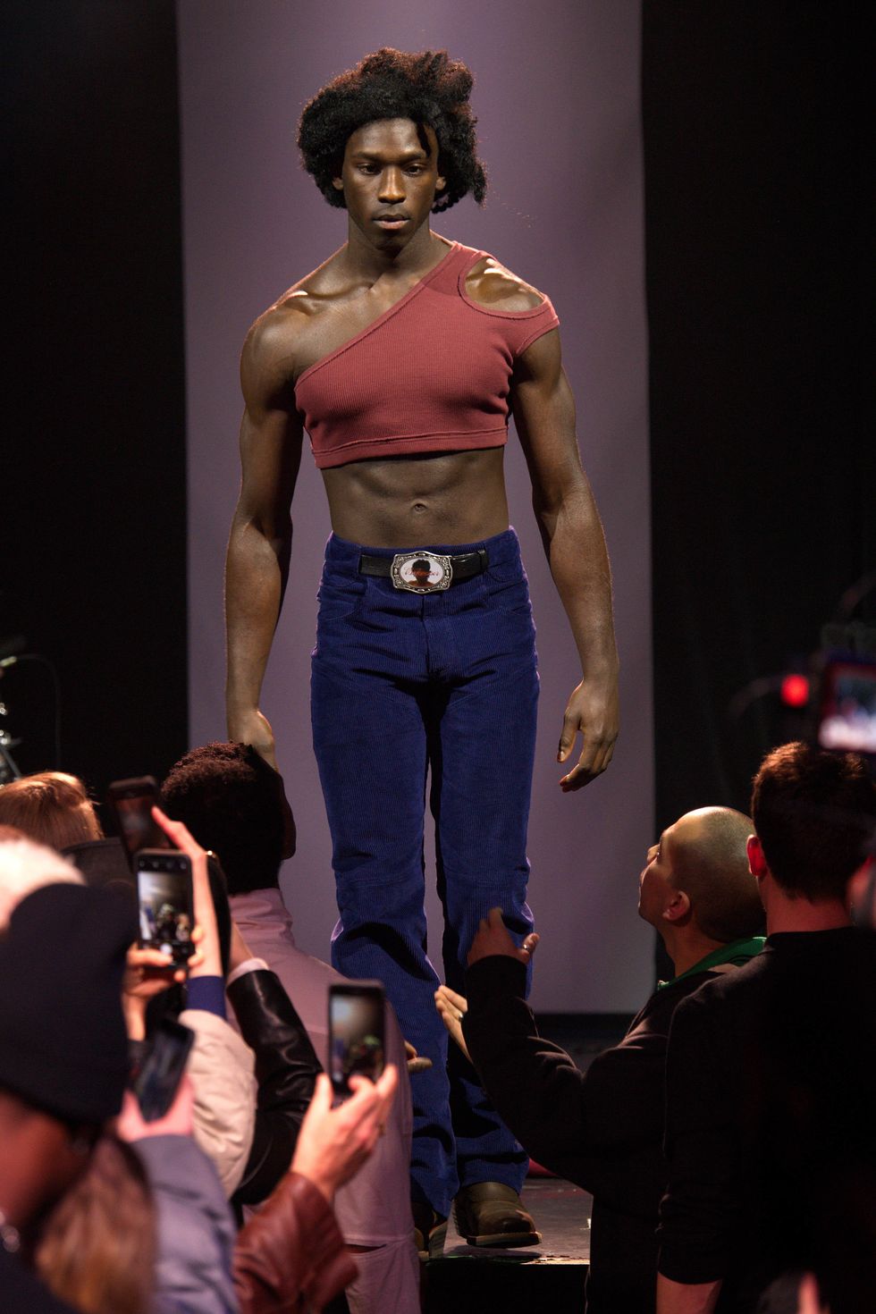 But the clothing, last night at least, came second to the showmanship. Dazzling Black cowboys were bathed in red and white light, with an unearthly live soundtrack from DJ Total Freedom and blues musician Robert Randolph that dared you to worship the models. And worshipped they were. The stage at Irving Plaza is too short for a traditional catwalk, and so the models (or "countrymxn" in Telfar-speak) just fell right off, stage diving into a crowd that held them up for all to see. They jumped with arms outstretched, knees bent at the right angle to be carried. Accompanied by a monologue by lauded Slave Play writer Jeremy O. Harris, the models floated through a crowd that parted like the Red Sea. A baptism by fire.