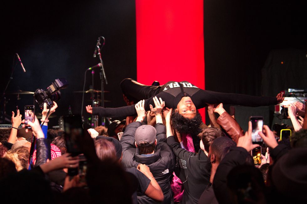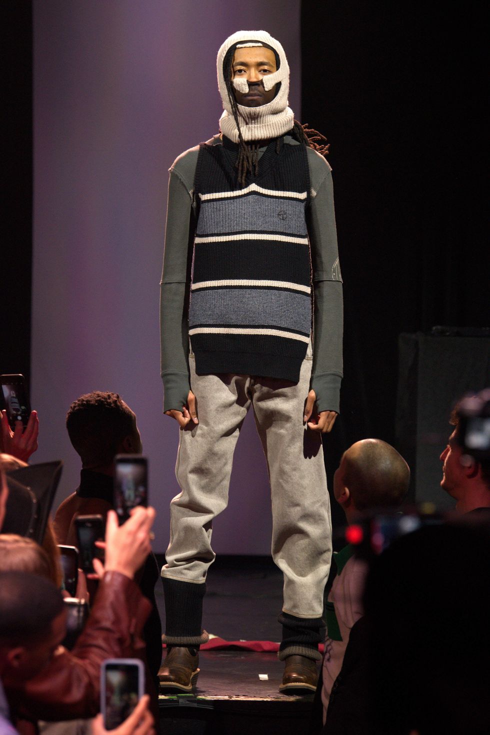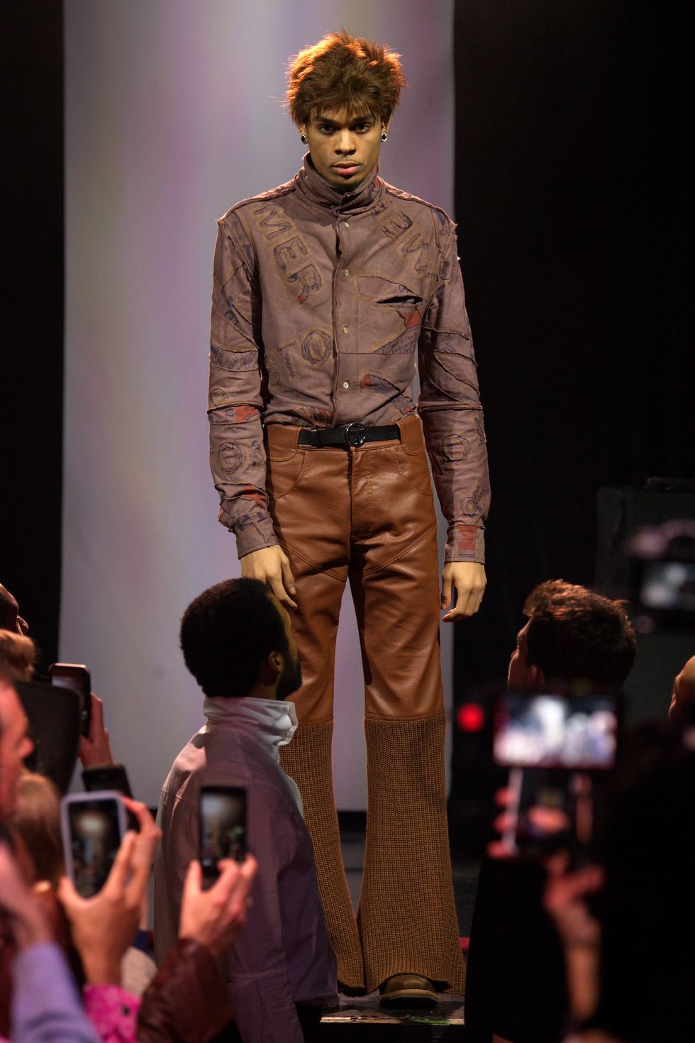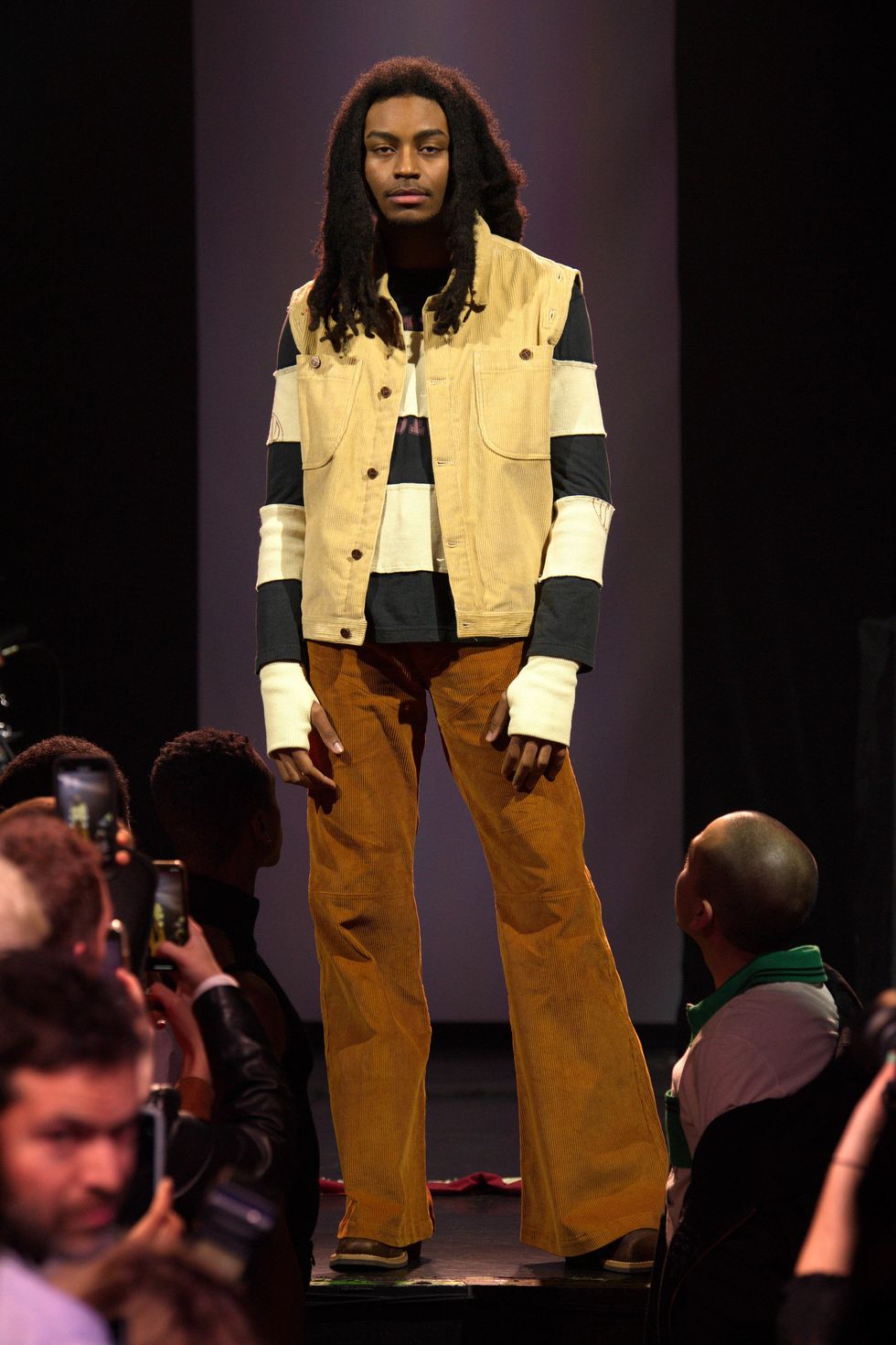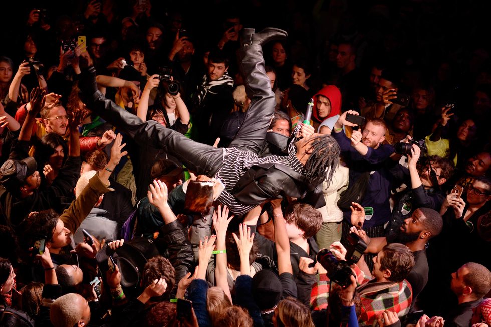 But the clothing, last night at least, came second to the showmanship. Dazzling Black cowboys were bathed in red and white light, with an unearthly live soundtrack from DJ Total Freedom and blues musician Robert Randolph that dared you to worship the models. And worshipped they were. The stage at Irving Plaza is too short for a traditional catwalk, and so the models (or "countrymxn" in Telfar-speak) just fell right off, stage diving into a crowd that held them up for all to see. They jumped with arms outstretched, knees bent at the right angle to be carried. Accompanied by a monologue by lauded Slave Play writer Jeremy O. Harris, the models floated through a crowd that parted like the Red Sea. A baptism by fire.