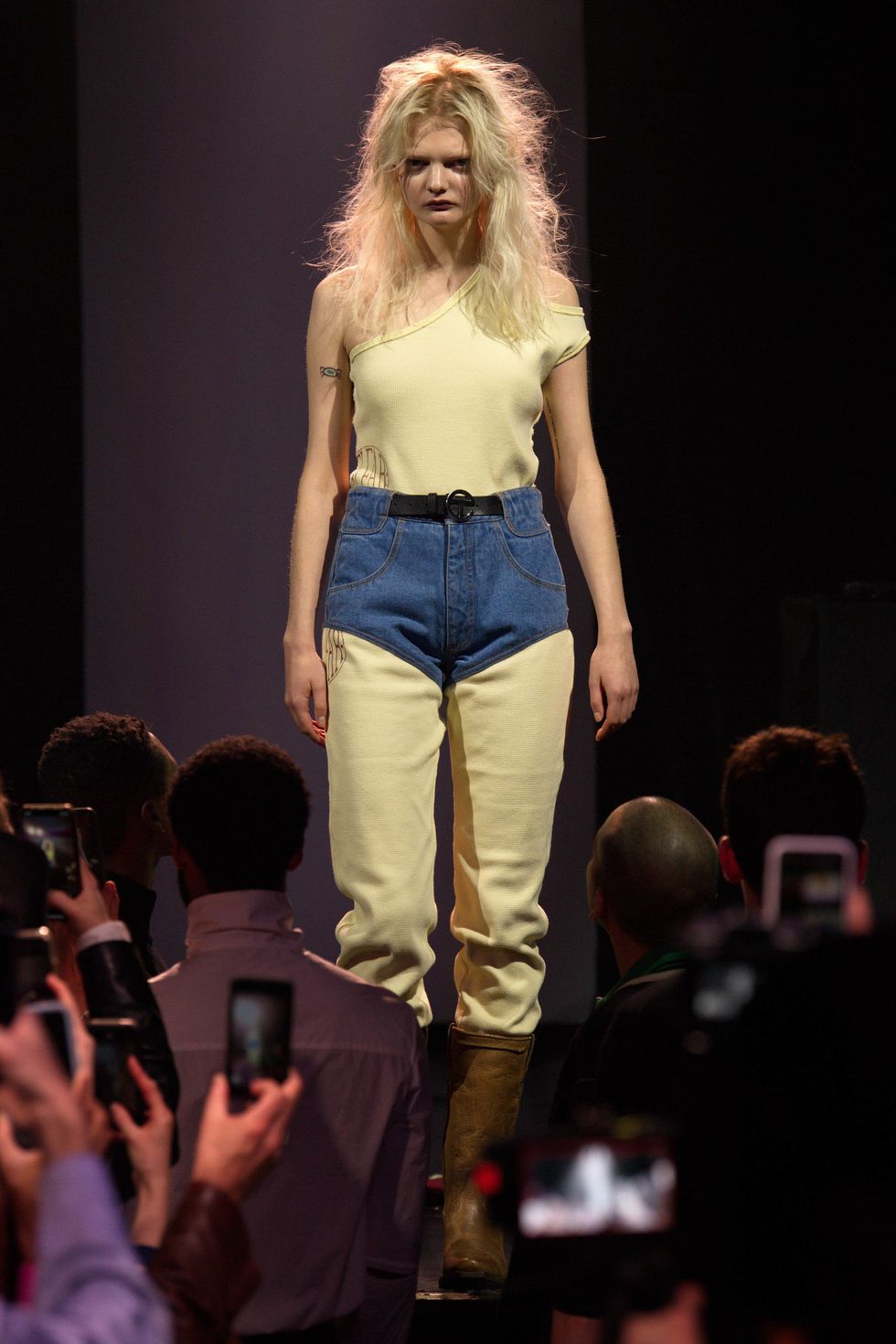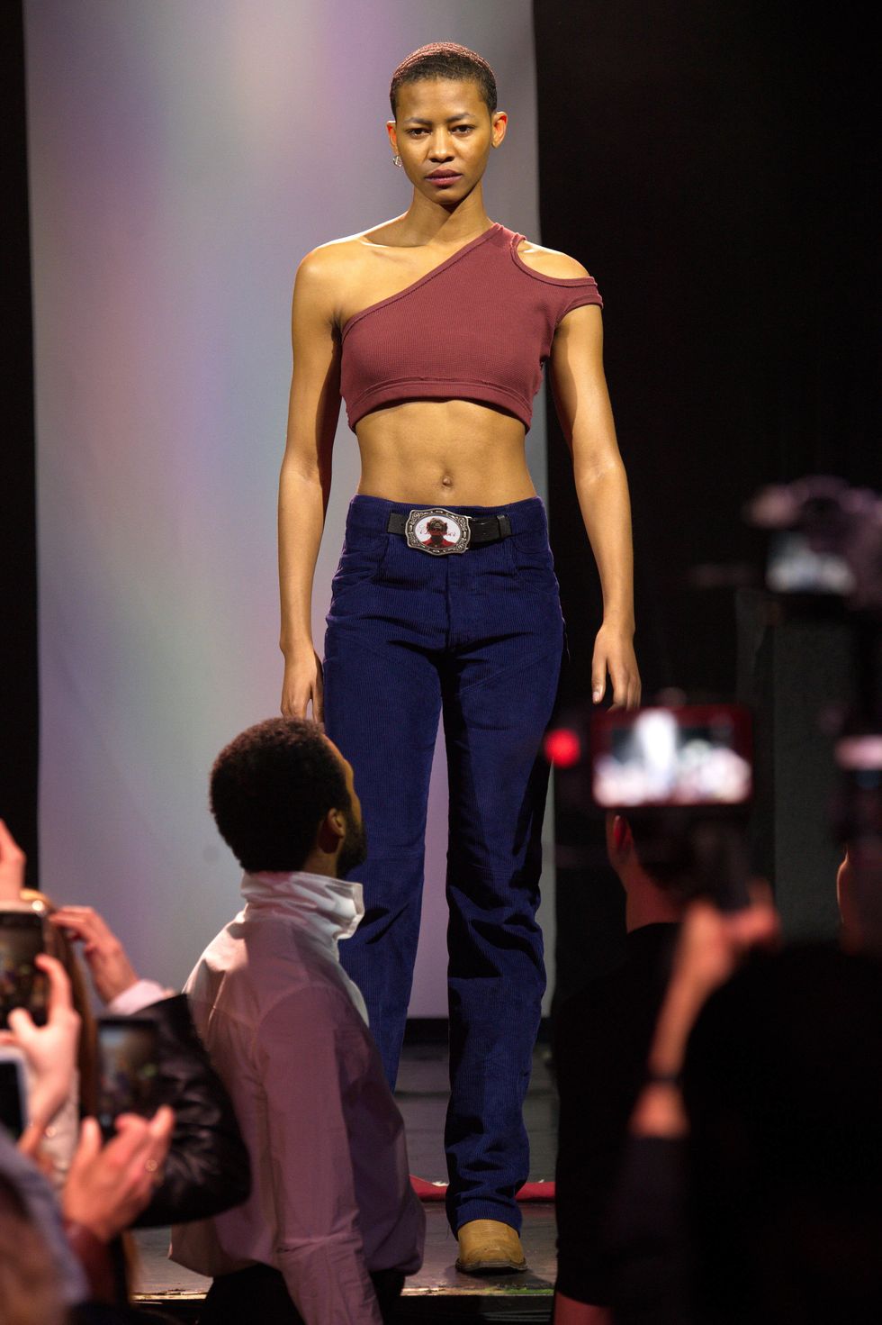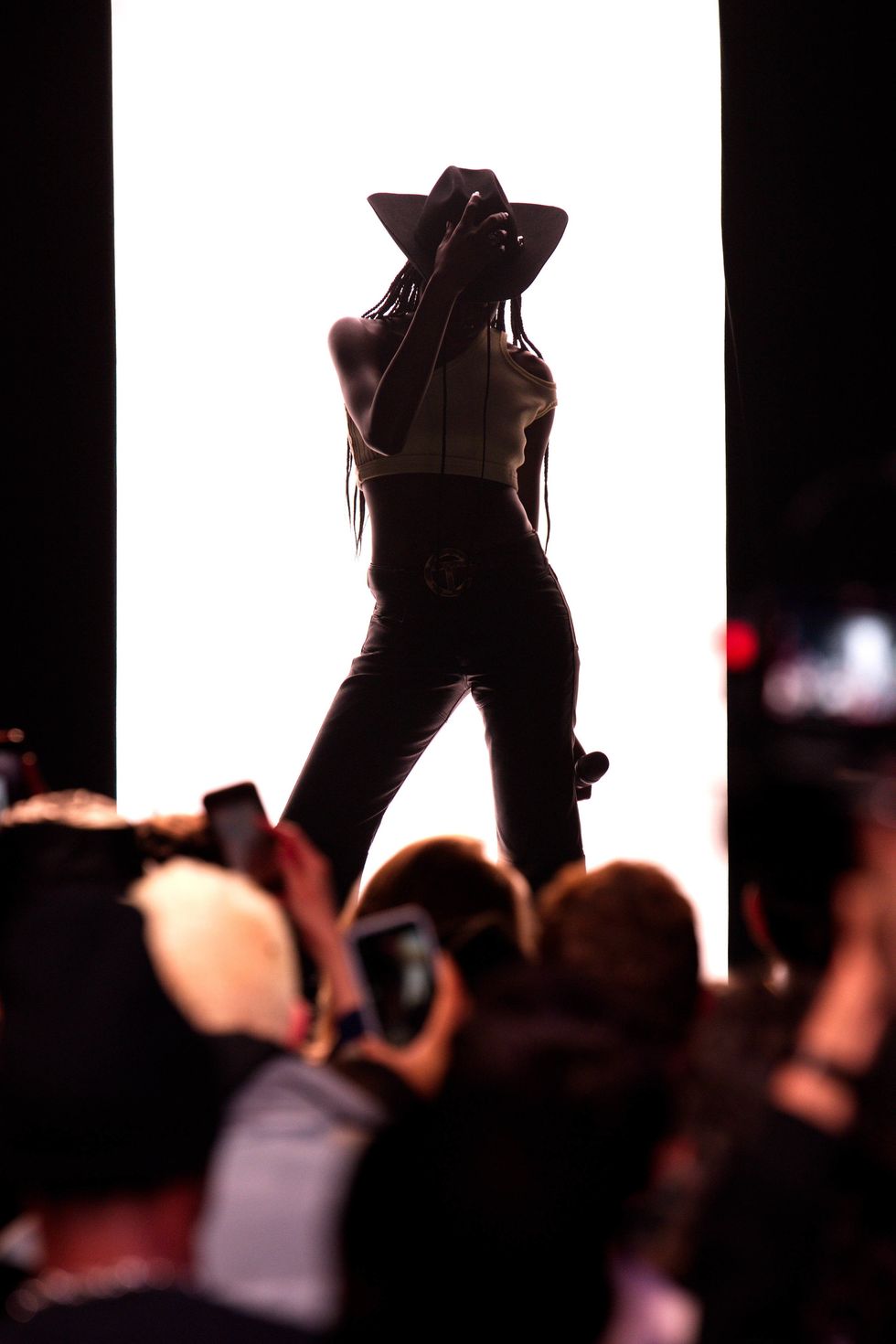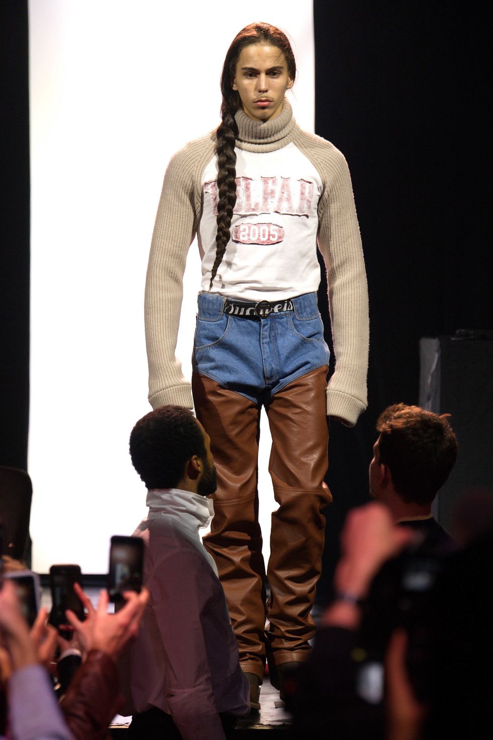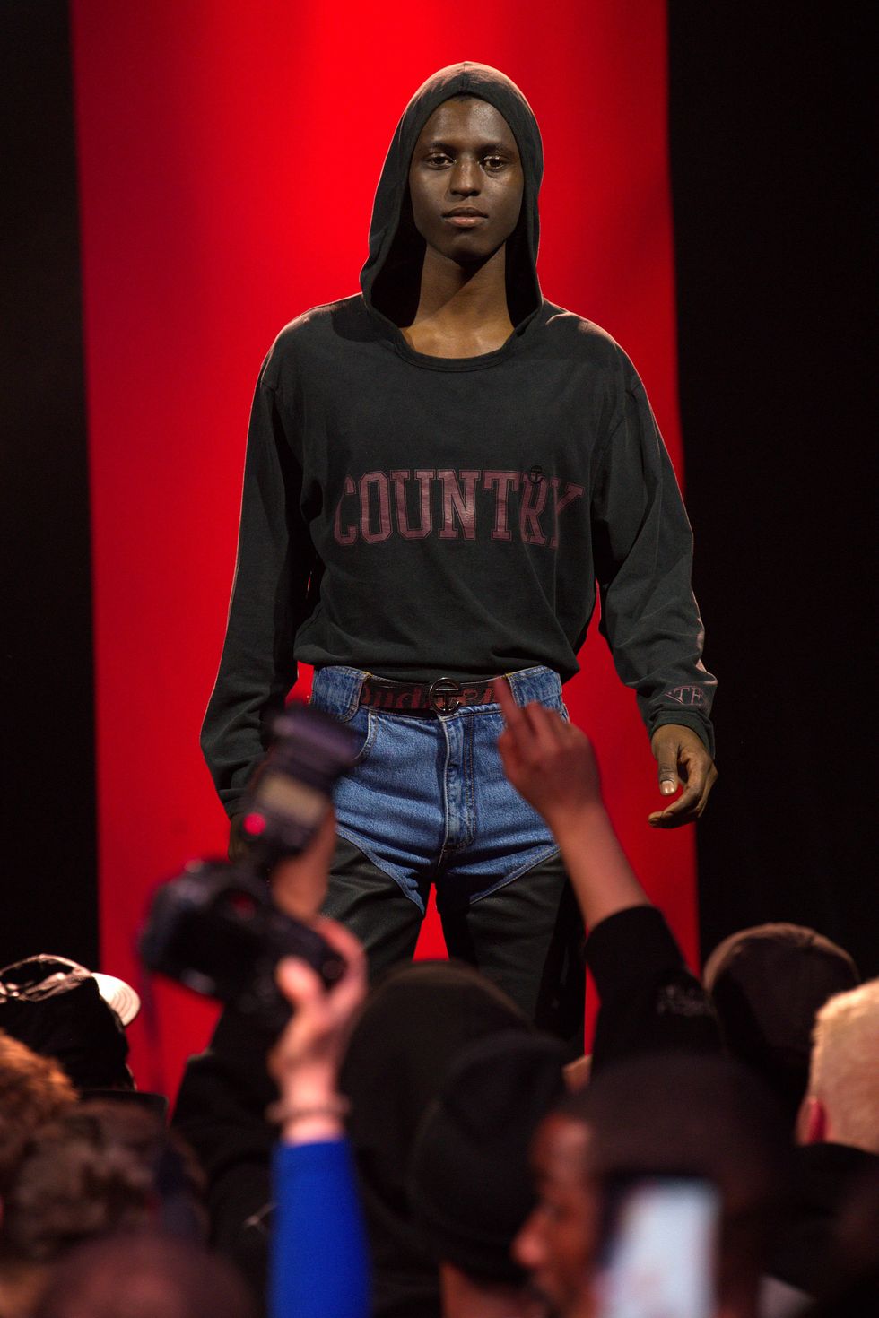 The moshing was a highlight — Ho99o9 rules, and also all of the band members are extremely hot, which is fun — but it was just the tip of the iceberg of Clemens' brilliant presentation. The show, called "Country" (emphasis on the "cunt") toyed with yee-haw aesthetics, questioning what it means to be a citizen in a place that doesn't seem to want you. "For those who land-ed here as objects, treated as a part of nature, we are all a little bit Country," read the show notes. "The sound we make is Country Music." The clothing consisted primarily of Telfar standards — asymmetrical tank tops and thermals – mixed with western accents, cowboy graphics and chaps.