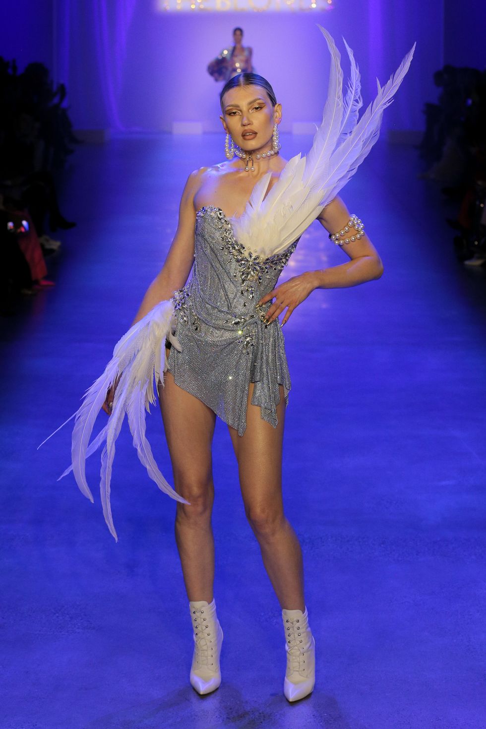 This season, The Blonds looked for heavenly inspiration with a collection that added a Latinx flair to the concept of fashion as religion. Combining classical elements like jewel-encrusted crosses and gold-plated crowns of thorns with rhinestoned face masks and Motorola's smartphone update of their classic Razr flip phone, The Blonds' futuristic opulence was equal parts ethereal and edgy.