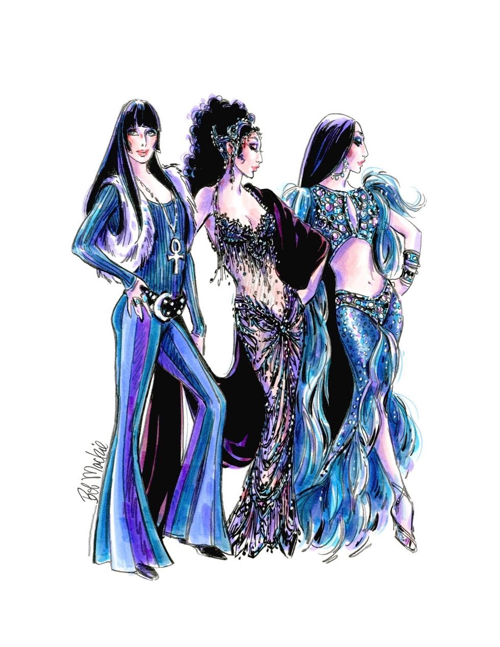 Illustrations by Bob Mackie for Cher's original ensembles.