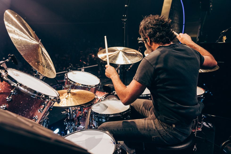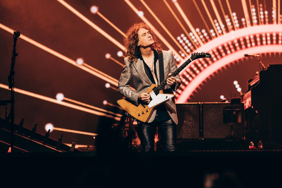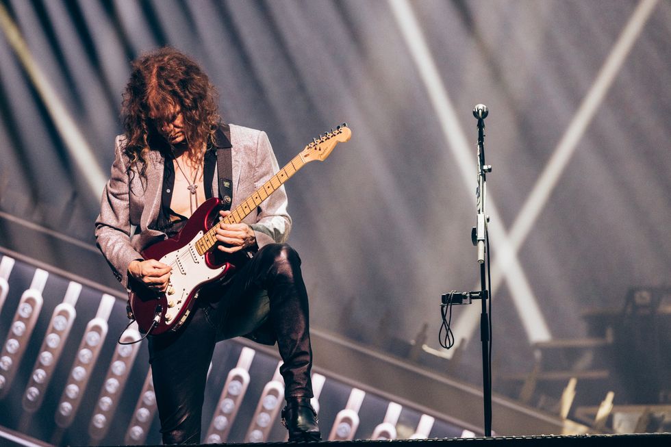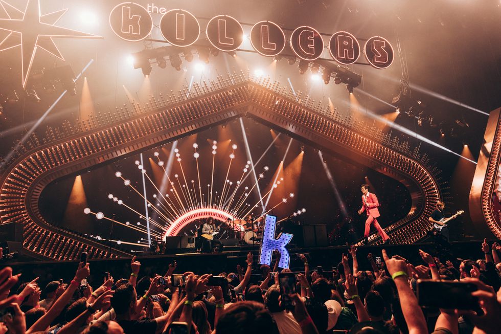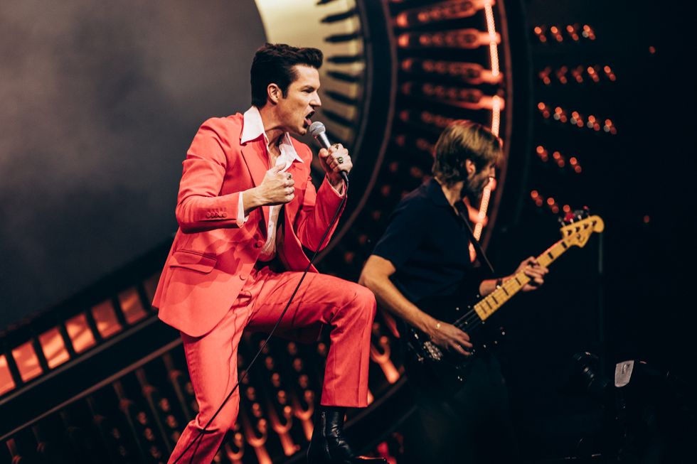 “I moved here from a quiet town in Utah when I was just 16 years old,” The Killers' frontman Brandon Flowers tells a sold-out crowd in Las Vegas, Nevada. “I had big dreams as a busboy working right here in Ceasars Palace. And I bet my life on three men I hardly knew,” he adds, as the Coliseum burst into cheers at the acknowledgment of his bandmates of more than two decades: drummer Ronnie Vannucci Jr., bassist Mark Stoermer and guitarist Dave Keuning.