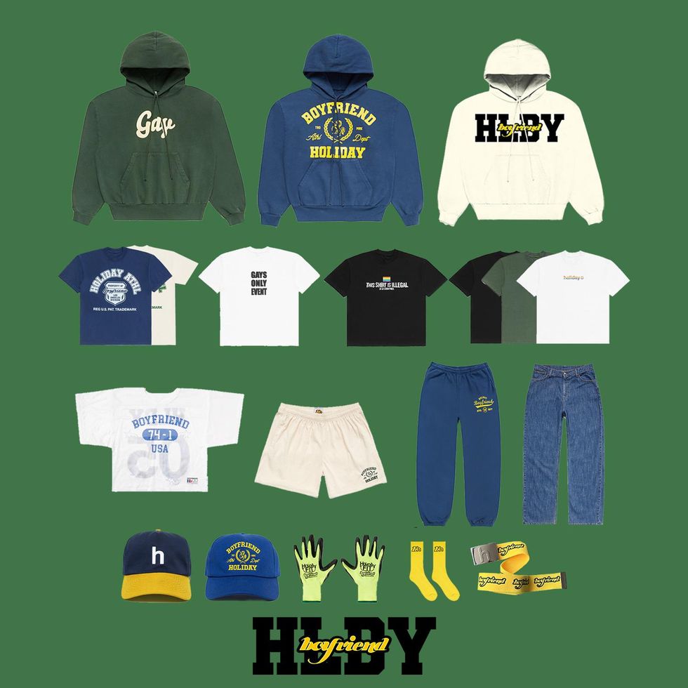 Nick Holiday's Holiday brand and Kevin Abstract's Boyfriend Warehouse brand are teaming up for the first time. The stylist-photographer duo (and real-life couple) launched a collection of t-shirts, sweats, hats, belts, gloves, jeans and football jerseys featuring "GAY" and "GAYS ONLY EVENT" slogans in vintage fonts and preppy graphics.