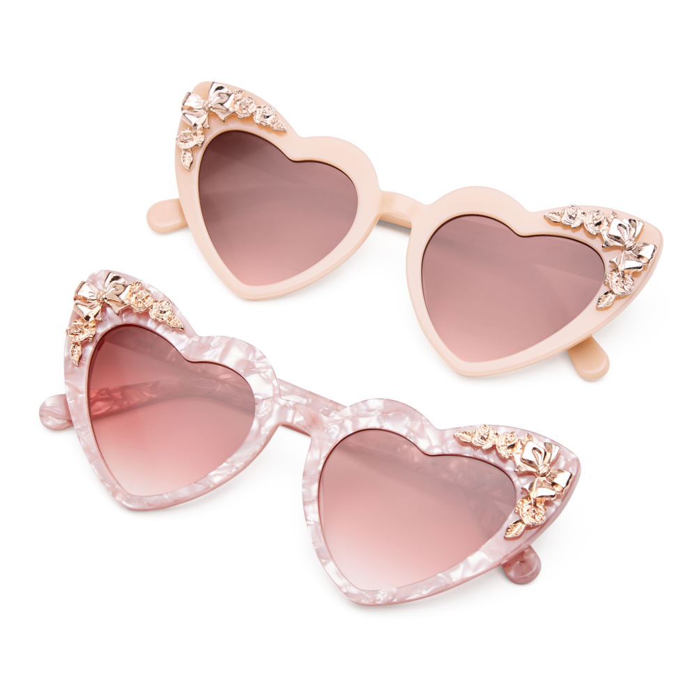 LoveShackFancy's first collection of sunglasses includes six styles in multiple silhouettes including heart-shaped, round, and oversized frames. Pastel hues including posh pink, cool blue, and golden peach with floral trims and the brand's signature floral prints.