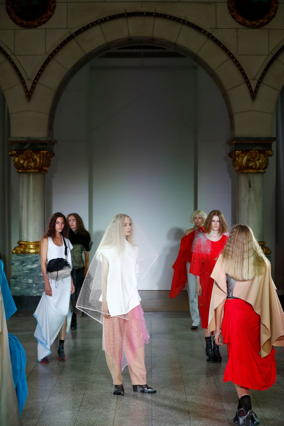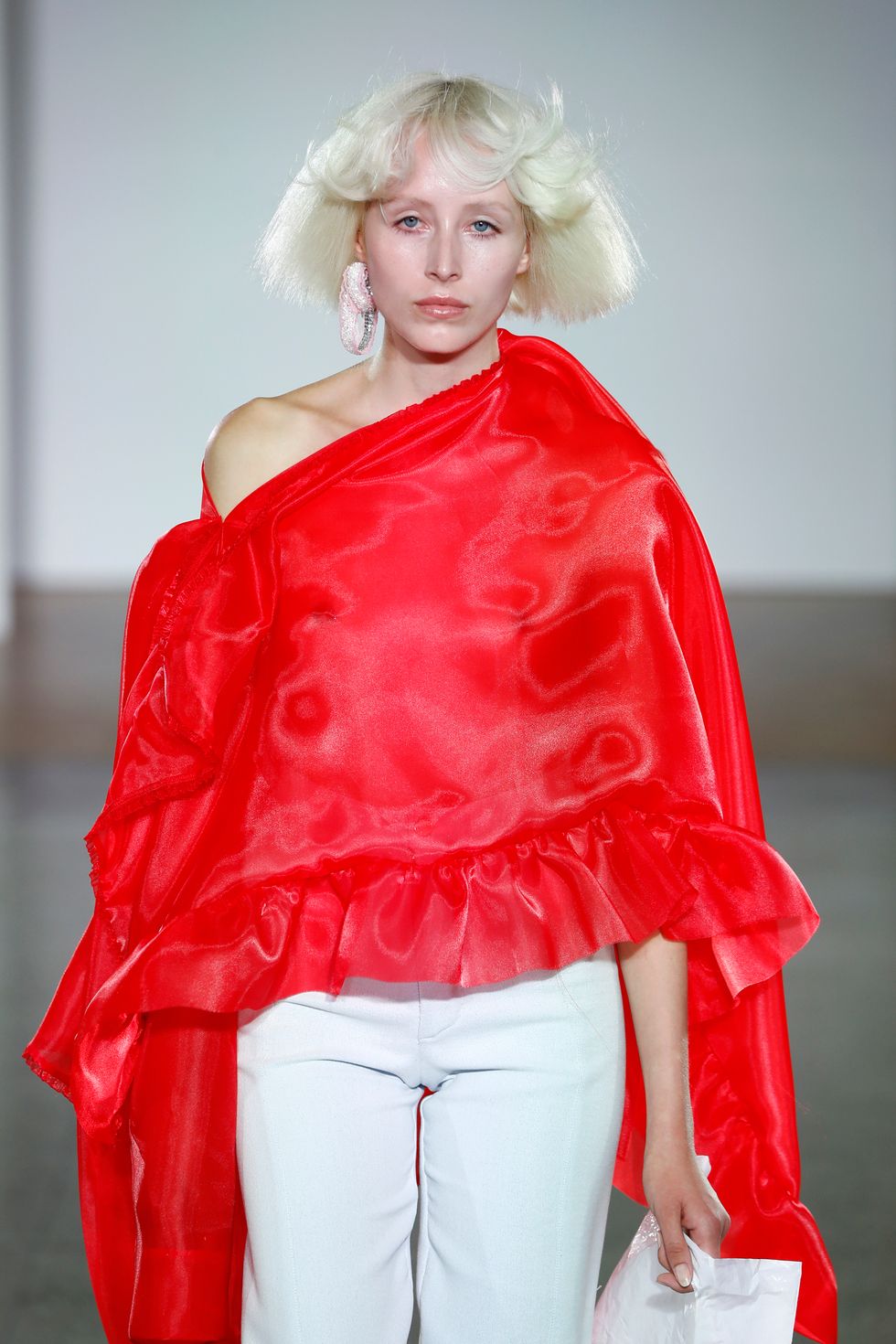 There is an obsession with drape, this season in "tacky" fabrics like paper thin synthetic silks in tarty red or a bedazzled, rainbow puff-paint satin. Resulting in a sweet unpleasantness that feels confrontational especially in the perpetually smiley nordic country.
