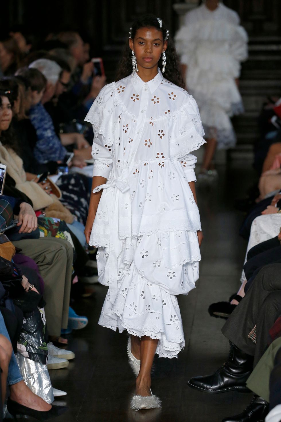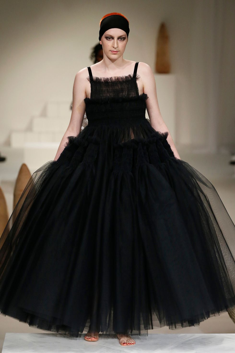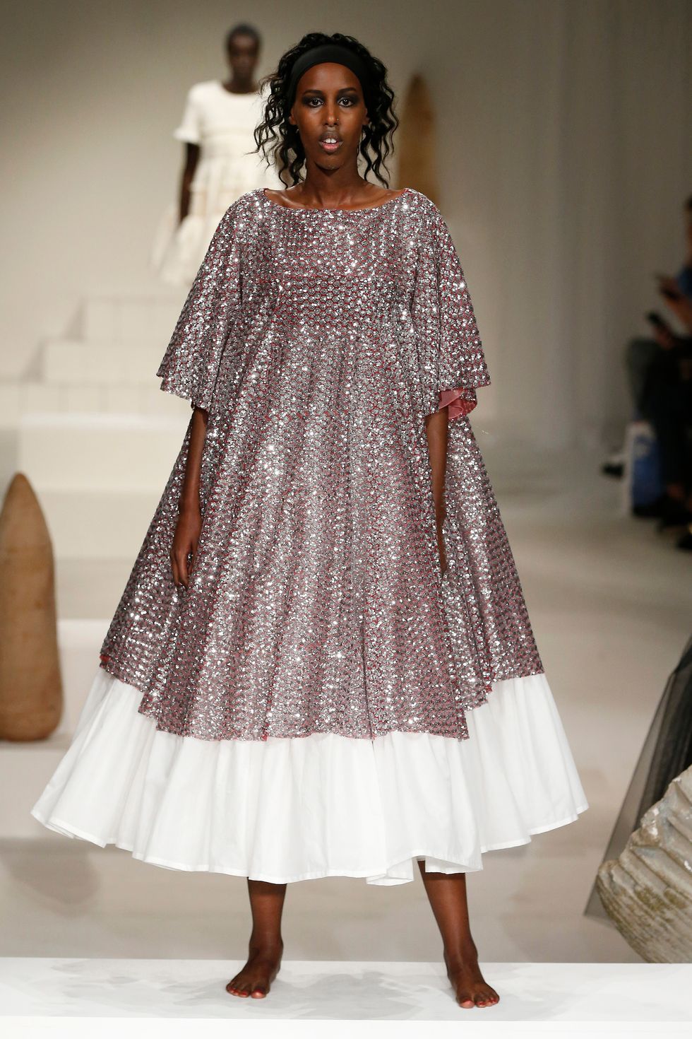We couldn't resist picking an oversized tulle look from Molly Goddard because it's her signature look we love but she also experimented with other fabrics keeping the silhouette eccentrically oversized.
