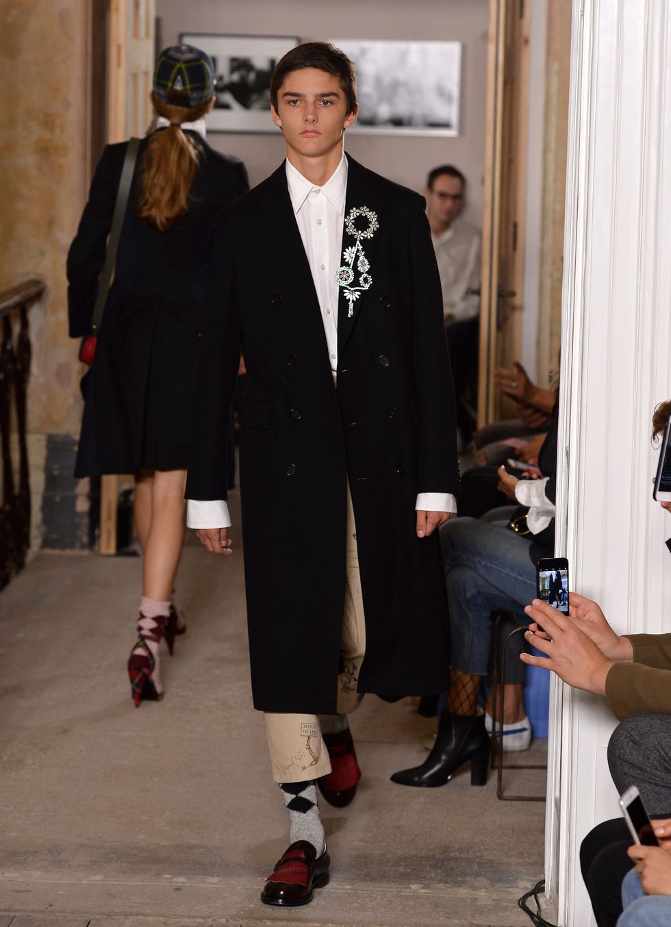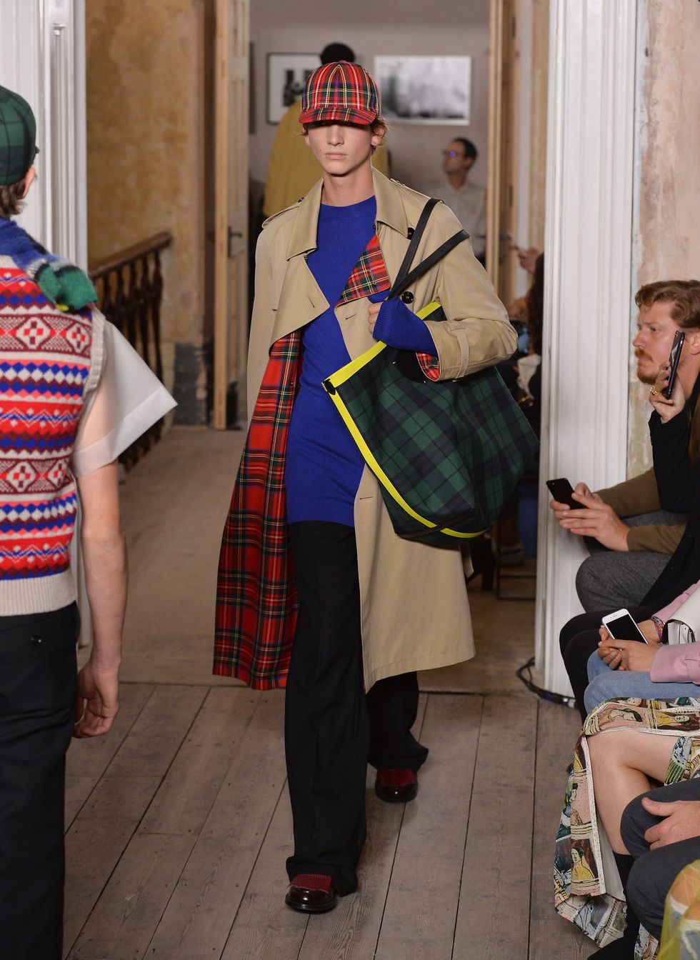 This Burberry felt super young and hip with wild mismatched plaids and oversized accessories including giant crystal brooches for men.