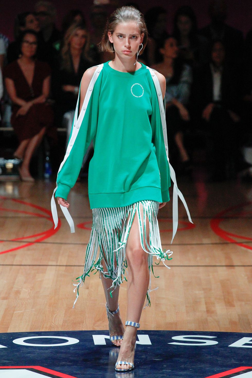 Set atop a basketball court, Monse has taken to redefining athleisure in this fresh, emerald number.