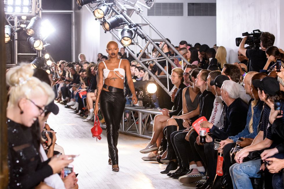 The buzz around the new concept for the Helmut Lang brand—an "Editor-in-Residence" with a rotating cast of designers contracted to produce (so far) one-off collections—reached a fever pitch this week with the first runway show since the summer's announcement. With Shayne Oliver, late of Hood By Air, at the helm for this inaugural go-around, the runway show was a fast-paced charge through the sexier side of Helmut. Less a direct reference, though an appearance by Lang stalwart Kirsten Owen was a strong nod, than a channeling of the original designer's energy and ambiguous attitudes toward flesh-baring, pieced together looks, the show fused Oliver's unapologetic and queer fashion POV with Helmut's esoteric but gutsy legacy. The notion that this was not a permanent relationship (Oliver + Helmut) gave the collection, which featured giant bras, Helmut merch tees, and a surfeit of harnesses among the highlights, a freedom that may have otherwise not existed. It was a great airing of the creatively dormant brand and looked hopeful for the progression this revered voice in the fashion pantheon.