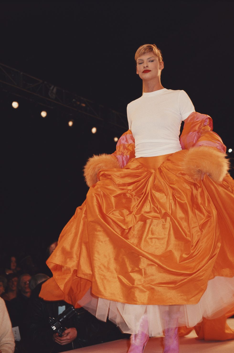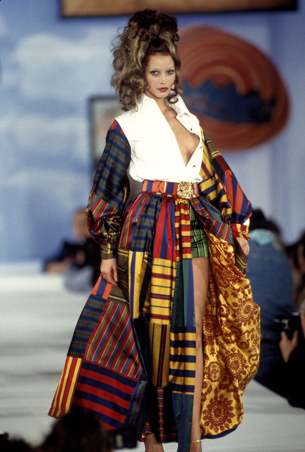 Todd's collection of '93, inspired by the dizziness of fairground rides and vibrant paintings of the carousel, was a kaleidoscope of multi-colour, print and kitsch campness. Supermodels of the moment, styled with an overdose of big hair and make-up, competed with New York drag queens, such as Billy Beyond, to the tune of RuPaul's "Supermodel (You Better Work)" as the audience cheered and applauded. This was undoubtedly a show that embodied the fun and freedom of sexual orientation. The show certainly was a contrast to the grunge movement of the time and one of my all-time favourite Oldham shows.
