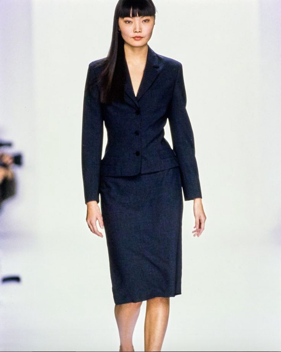 Power dressing at its best, Donna focused on the New York business woman of the early 90s, jersey bodysuits teamed with the classic 'white shirt' worn with tailored Wall Street-inspired suits. This collection dominated the editorials of the 90s with an advertising campaign entitled 'In Women We Trust' featuring Rosemary McGotha. Donna's '92 collection is a vote towards the woman who is strong, powerful and confident and knows what she wants.