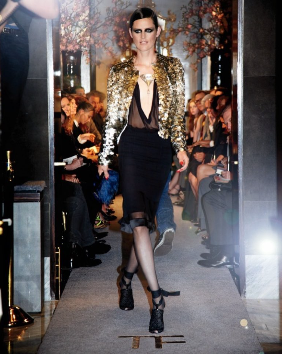 Ford's debut collection is one of the most beautiful shows to this day; the presentation echoed that of the past salon couture style shows. 90s Supermodels, Hollywood and music stars all took turns to showcase in what can be described as a celebration of women's beauty of all ages. Lauren Hutton, Amber Valletta and Beyoncé walked the runway in a collection of pure indulgence married with high fashion luxurious looks. This collection certainly would not look out of place if shown during the Paris Couture shows. This is glamour at its best.