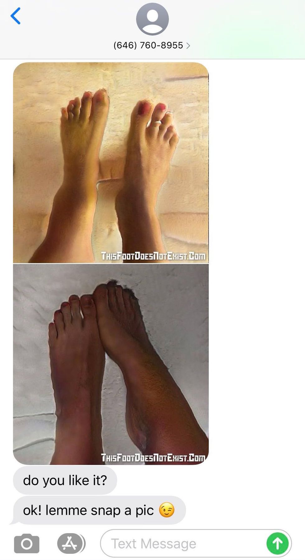 All you need to do is text the number on the site (646-760-8955) and it will continue sending you pictures as long as you keep texting back. "We trained a computer to create fake foot pics," the site says. "Text our robot it'll send you feet."