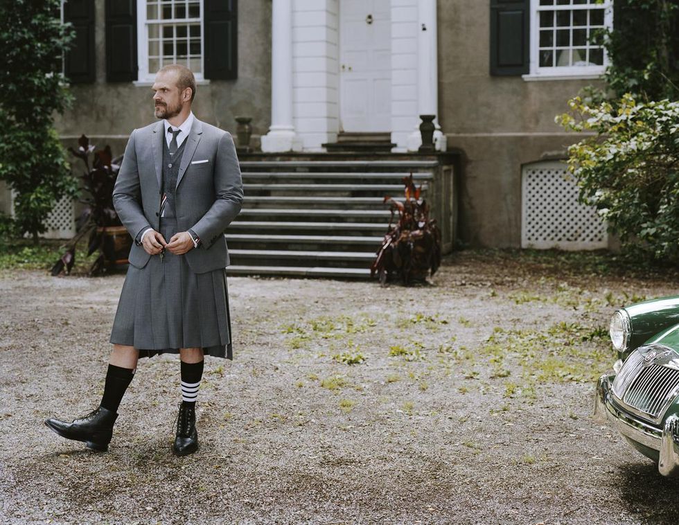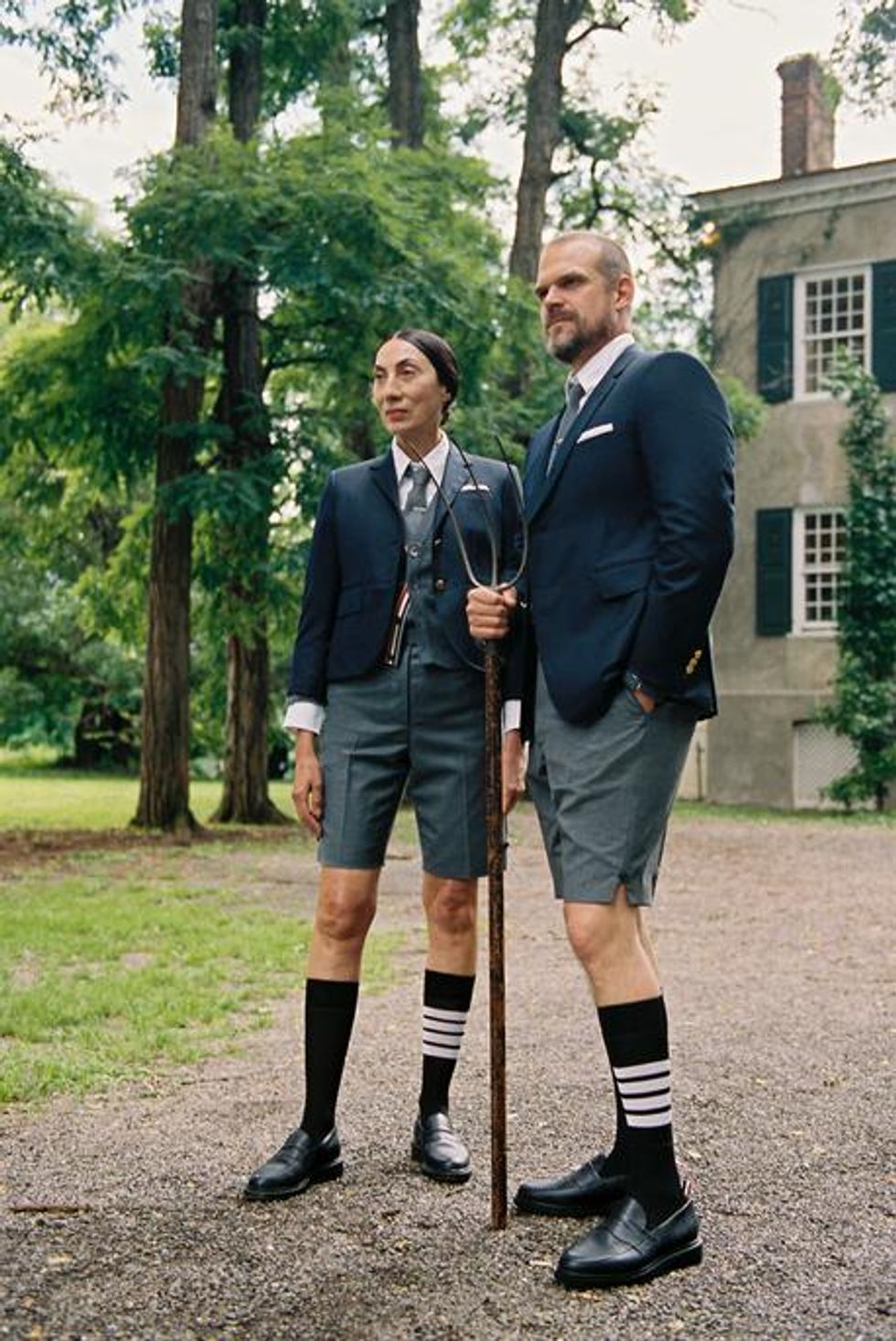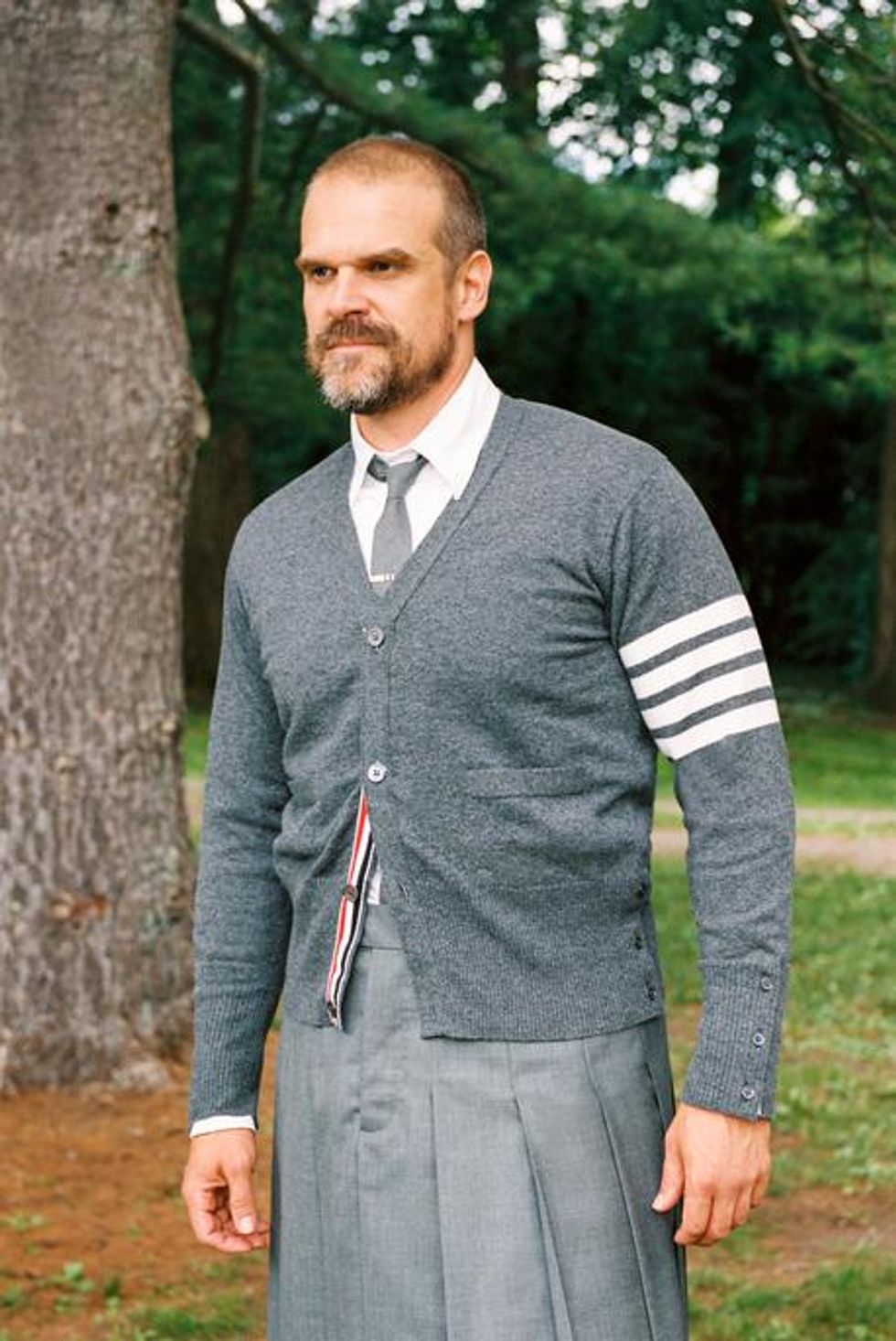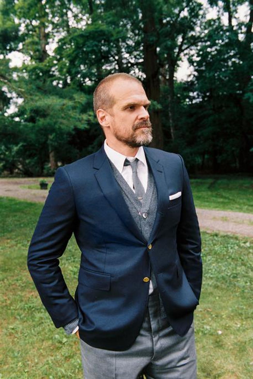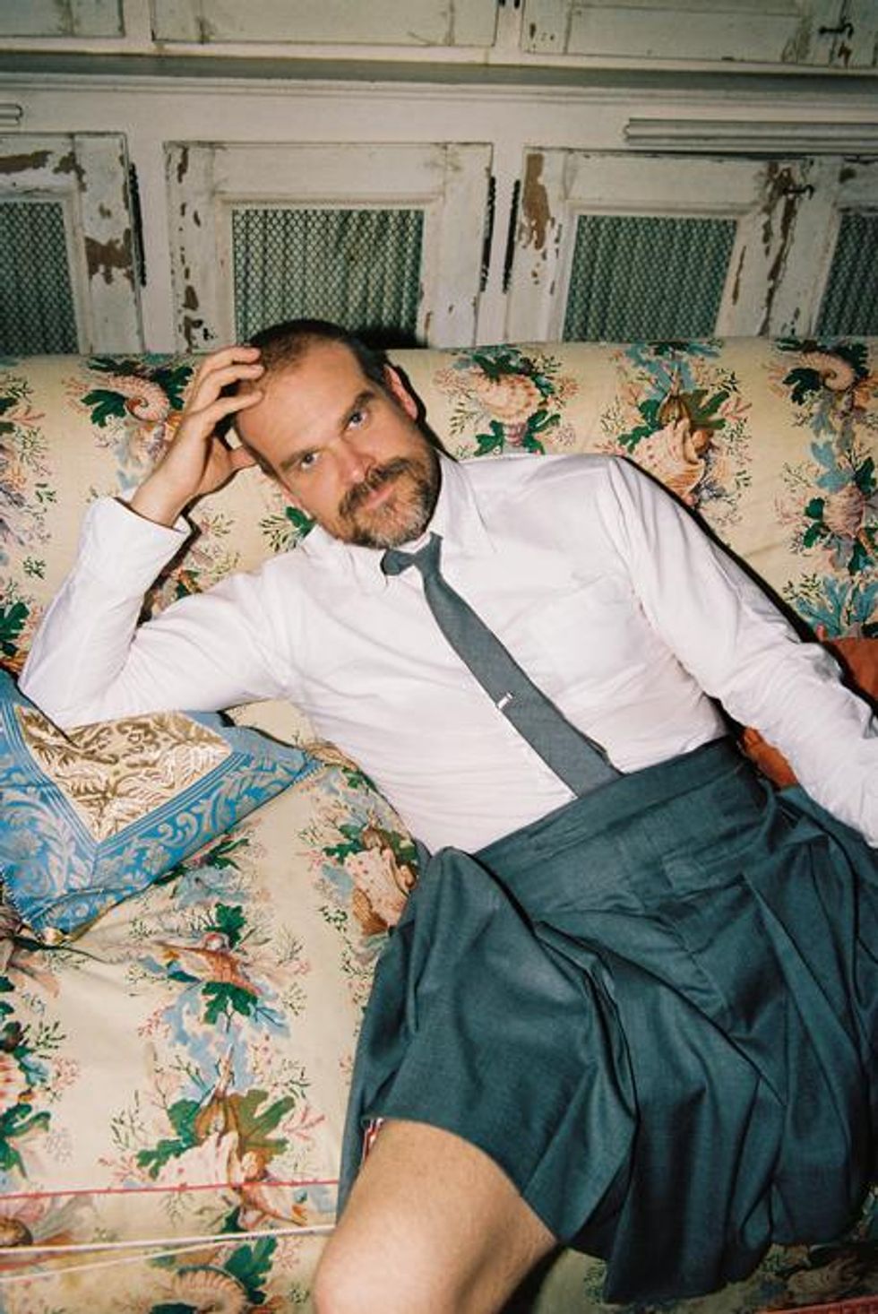 He's also been busy teaming up with some unexpected faces to bring new life into his classic approach to gender dressing. On the heels of his viral shoot with Gossip Girl's Thomas Doherty, which sought to "redefine the masculine image," Browne is unveiling his latest film and portraits with the rugged Stranger Things actor David Harbour.