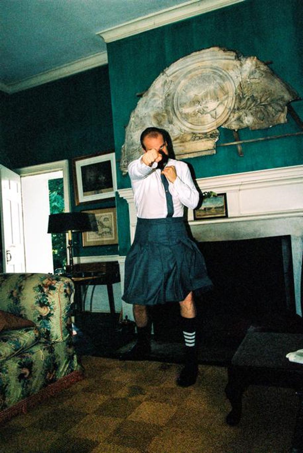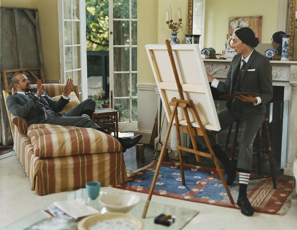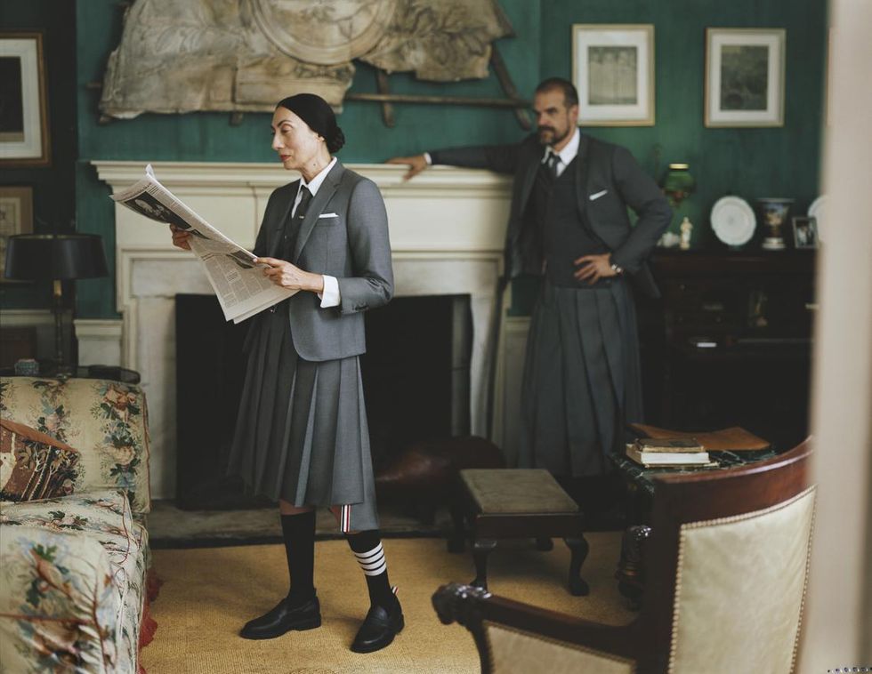 Alongside the iconic French-American art legend Anh Duong, Barbour was tapped to show off the brand's core offerings and gray tailoring from their fall wardrobe, including its signature pleated skirt. According to a press release, Browne was looking for a man and a woman who would "bring their own identities" and "reinterpret the clothing for their own lives."