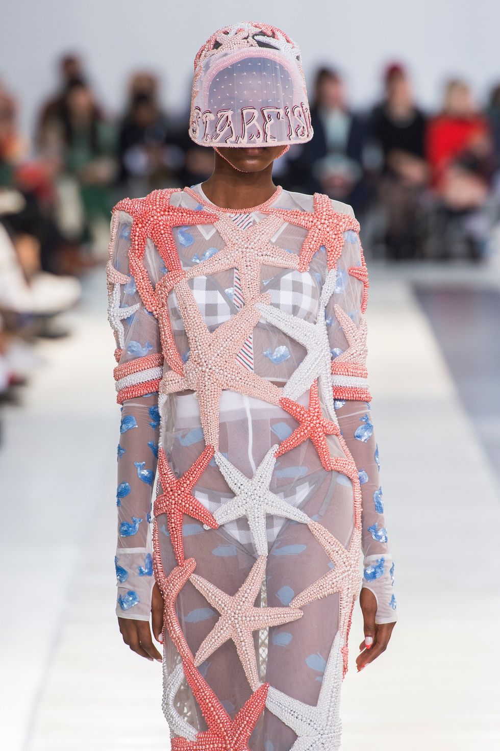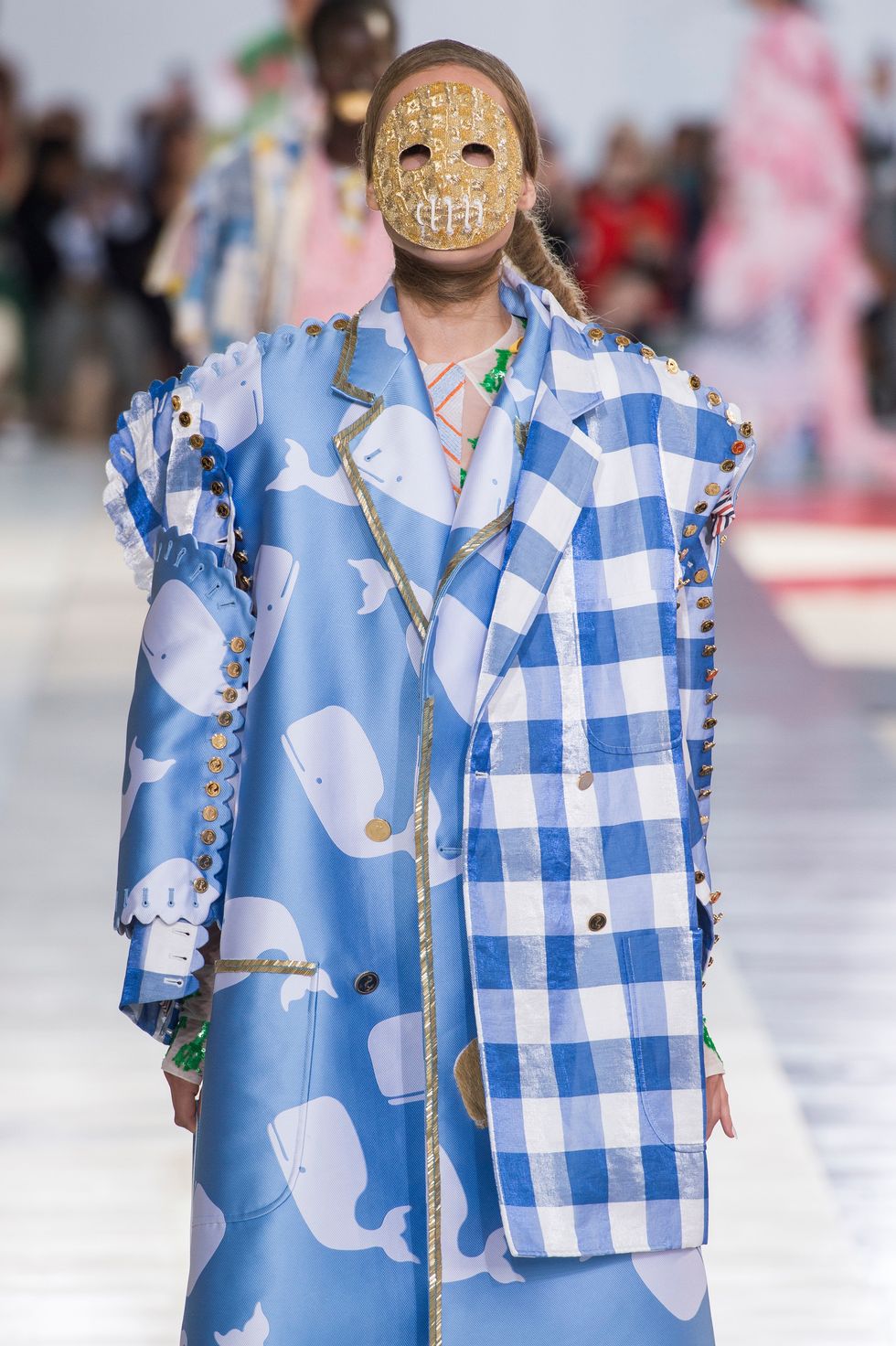 For those wringing their neck about the Italian menswear company Ermenegildo Zegna Group acquiring an 85 per cent stake in Thom Browne's business recently, fear not. The designers absurdist vision is still intact for now. Last season's motley cast of technicolor characters packed up and headed to the beach. The runway for Thom Browne's eclectic dreamscape of a spring 2019 show came complete with a boardwalk, sand, and a few gnomes for good measure. With that sort of setup, it was fitting that the clothes themselves were just as whimsical. Knitted starfish, anchor prints, feathered seagulls, and seashell bras all made it to the runway.
