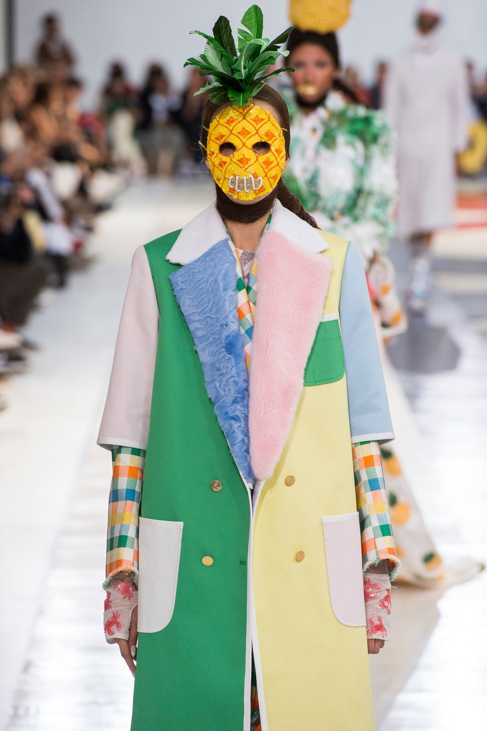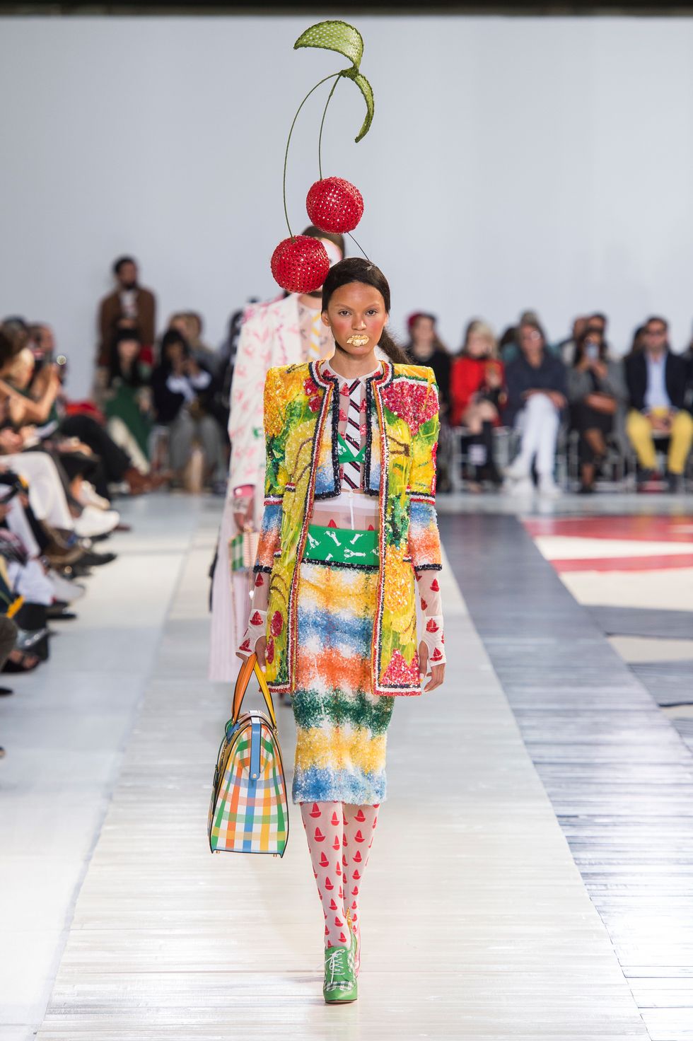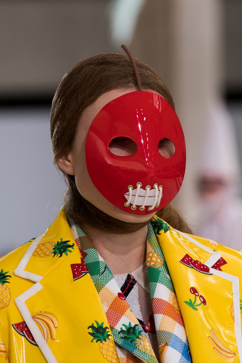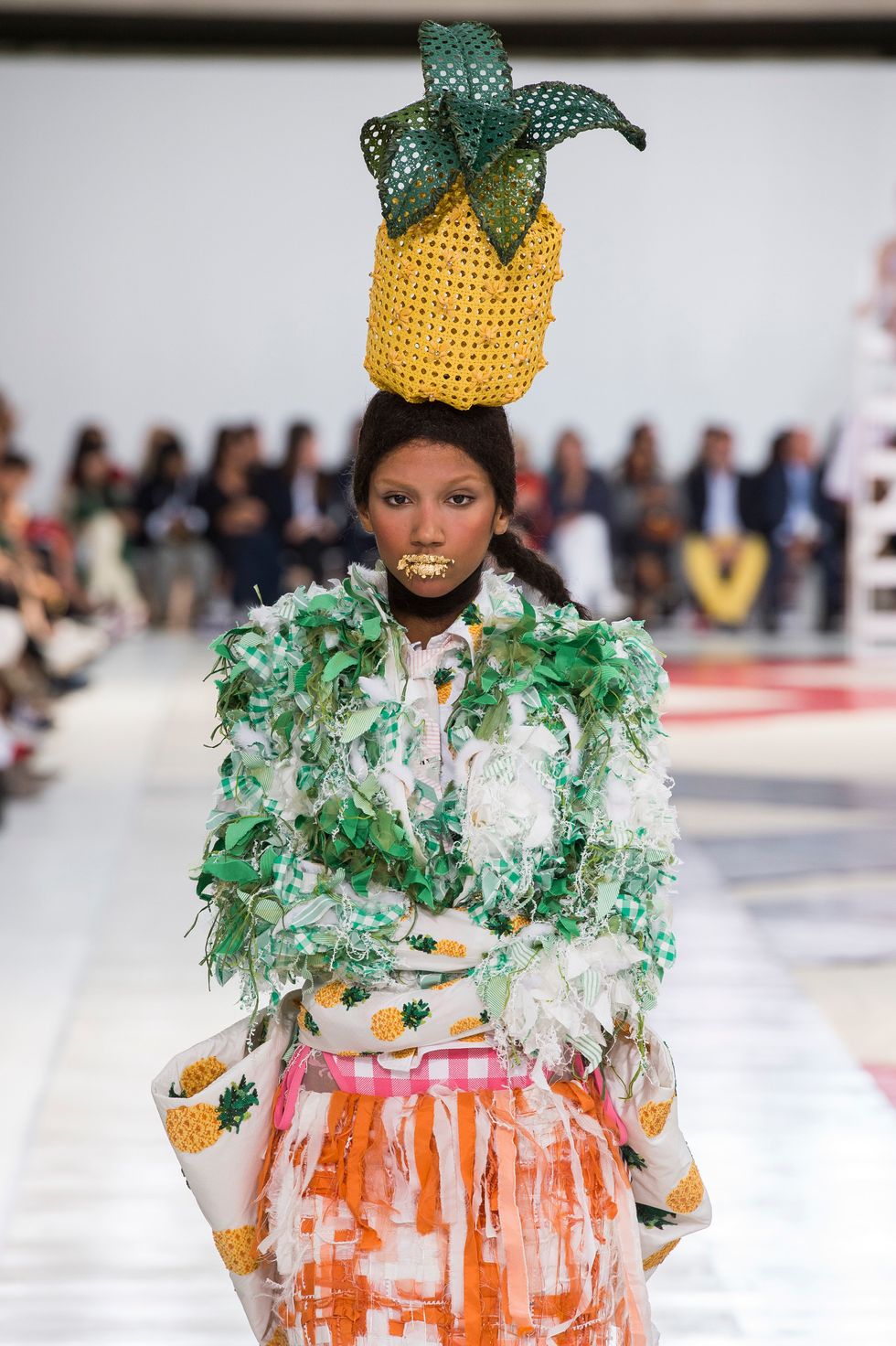 Amidst a bountiful harvest of fruit-printed patterns, Browne didn't forget the cherry on top. Literally. Early into the show, two massive cherries stemmed together with a net-detailed leaf floated down the runway on a model's head. It was only the first of a series of fruit headpieces, as a watermelon slice and pineapple also appeared.