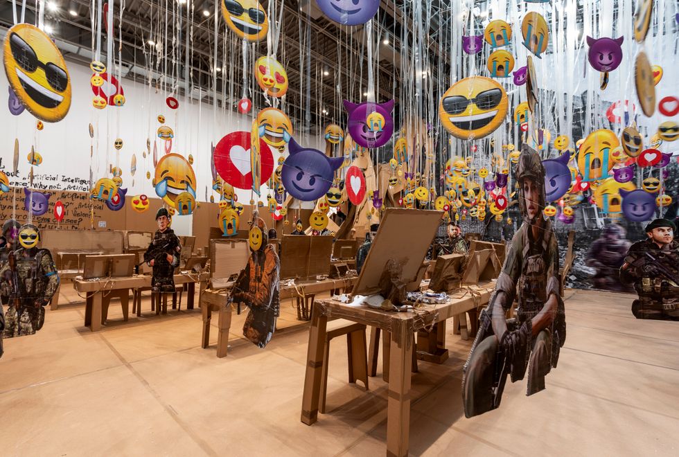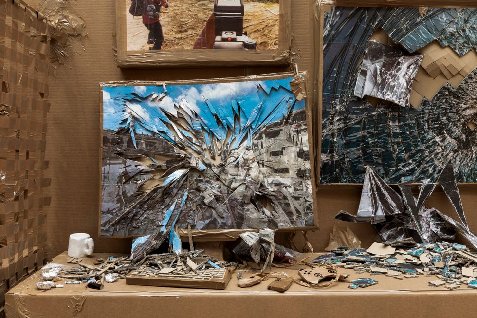 In keeping with this philosophy, Hirschhorn’s latest show, Fake It, Fake it – till you Fake it, at Gladstone is a DIY disaster zone, an exploded view of online violence stitched together entirely out of cardboard and packing tape. It’s installation as a grating Adderall high, an over-stimulated, beady-eyed assemblage of Red Bull cans, Apple products, and RPG carnage — one that takes in disastrous information and registers it as a funny deadpan joke. Canvassing every inch of a space that’s normally as vacant as the surface of the moon, Hirschhorn has transformed the gallery into a bombed-out, hyper-immersive gaming pit. Desks lined with cracked computer monitors flicker with screen grabs from first-person shooter games as simulated violence spills over into heaps of real-world debris. These piles and aisles form rough alleys for the viewer to navigate, which are interspersed, arcade-style, with life-size cut-outs of gun-toting soldiers and flurries of dangling emojis.