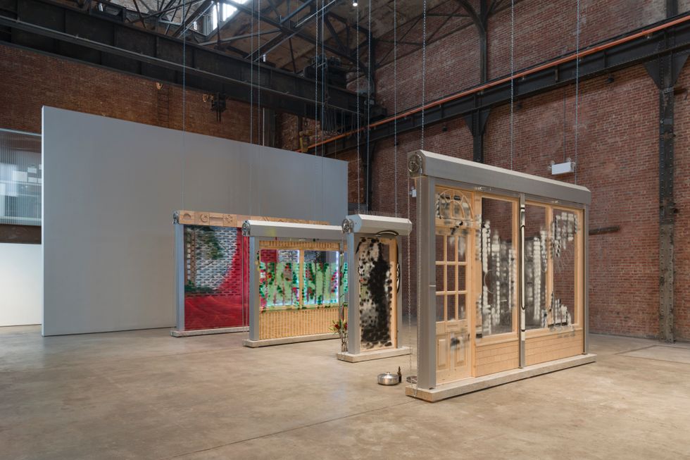 The show’s conflicted high point is Silent Weapons For Quiet Wars (...SEOUL TO SEOUL TO...). Along the top ridge, Germain has had the flags of origin for many British immigrants (Bangladesh, Pakistan, China, Poland, Trinidad and Tobago) carved into the wooden moulding.The spray painted mural that covers its main gate appears hazy at first, but it gradually coheres into a landscape full of fluffy clouds and sloping mountains. When the gate is raised, the paint becomes abstracted while also revealing the Union Jack and St. Andrew’s Cross carved into the bottom panels. What begins as a recognizable sense of place becomes fragmented and distorted the second it’s incorporated with the British flag.