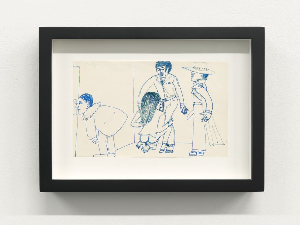 Wright’s contribution to the show is an aesthetic time capsule, offering work that dates all the way back to the 1970s. His drawings feature the kind of hairy, no-bones (or rather, all bones) promiscuity that you only encounter in vintage pornography, depicting the Golden Age of Cruising in all of its dank glory. Scenes of polymorphous perversity spill out of stalls and into orgies of pulled hair, fucked faces and soiled clothes. Wright’s work depicts these all-out bathroom royales with the kind of craggy, Richter-scale jumping lines and seedy/sensual detailing that one usually associates with Expressionists like Egon Schiele and George Grosz.