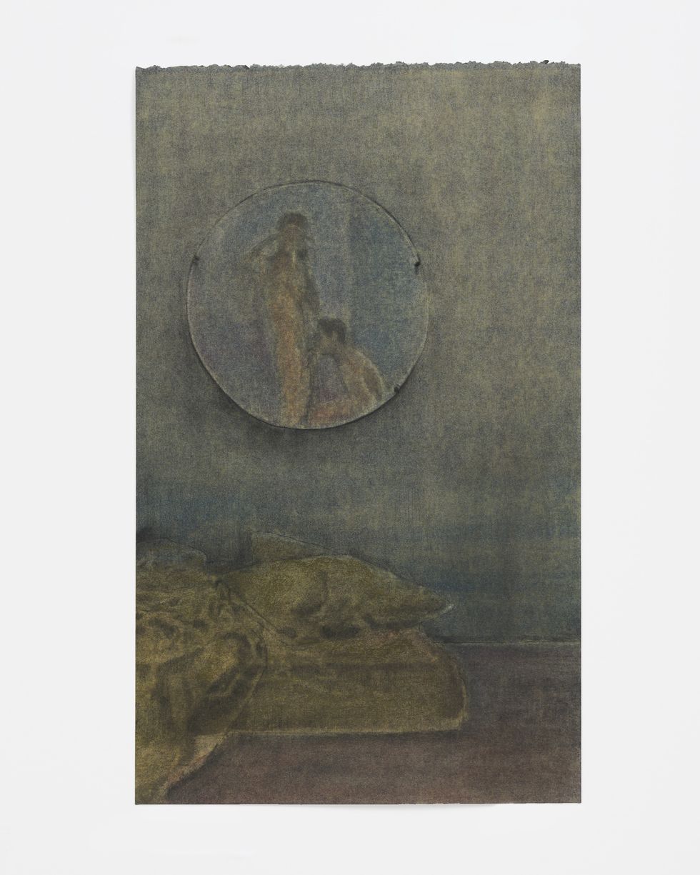 Christopher Culver by contrast works from the remove of almost half a century, from the other side of a historical chasm that spans the AIDS epidemic, gay marriage and the death by gentrification of Wright’s old New York. His layered pastel and charcoal drawings are drab and bleakly beautiful, honing in on scenes of urban alienation and private despair, split between the city’s grimy interstitial zones and domestic scenes where the walls seem to be closing in in real time. Culver is spiritually connected to Wright through the transience of his work, although both men adopt radically different attitudes toward it. Where Wright’s drawings are lit up by a silly, slapstick joy, Culver’s in comparison, are deeply wounded. In pieces like the brutal throat-fucking of “Two Farmers” (2024) sex is depicted as a quick and desperate fix rather than a full body high. His technique gives the piece a gnarly tactility, with the blotchy plains of discolored flesh offset by the chain-link texture of the cocksucker’s necklace.