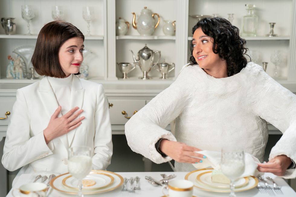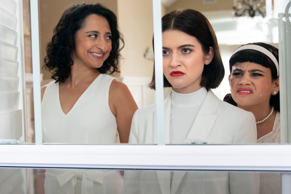 On TV, the three Debras are living their daily pointless lives, with notably absent partners and a pervasive sinister energy. The three Debras only wear white. All their spaces are way too big, which gives the show an afterworld quality. They had to wear robes and bibs to protect their costumes. "We were all very dirty, we all had our period every day," Jouhari says. "The most stressful part of doing the show is not spilling."