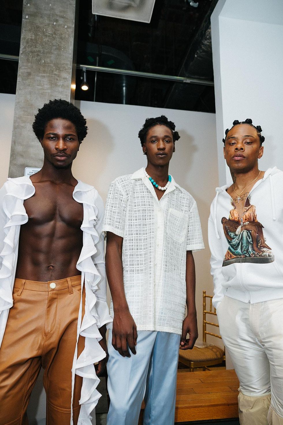 This season, Adeola introduced menswear for the first time: Breezy short-sleeved button-ups in shades of baby blue and soft pink that she styled with colorful, beaded necklaces. One model wore a dreamy, white open robe with leather trousers. Another modeled pants that looked like they were fashioned from a royal ballgown, dressed down with a zip-up hoodie she printed with the brand's Black Jesus motif.