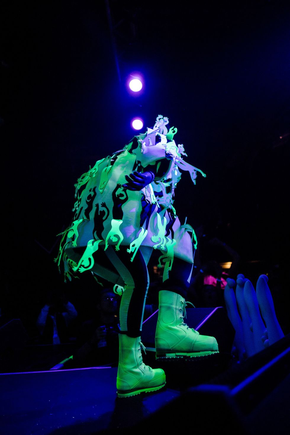 In Chicago, Whack created something of a deranged freak-show carnival, complete with a windmills made of doll parts and mutant skeletons. She wore a white, voluminous, oversized lab coat made of mannequin men that glowed in the dark. Designed by Stina Randestad, they are meant to resemble crowds of men praising Whack, but hung upside down, so they are forced to look up at their queen.