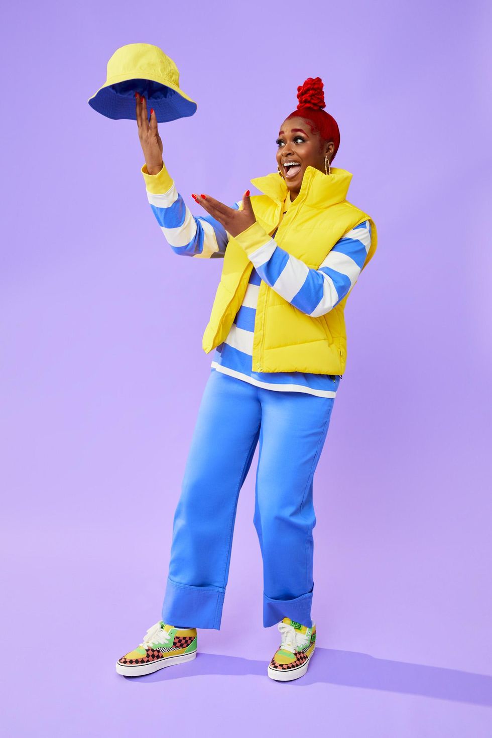 Among her favorites from the collab are the Weird Hype checkered Old Skool shoes and the yellow Standard Snow MTE boots. Other standouts include a yellow pleated skirt, the 'It's Okay to Cry' 2fer shirt and the yellow puffer vest.