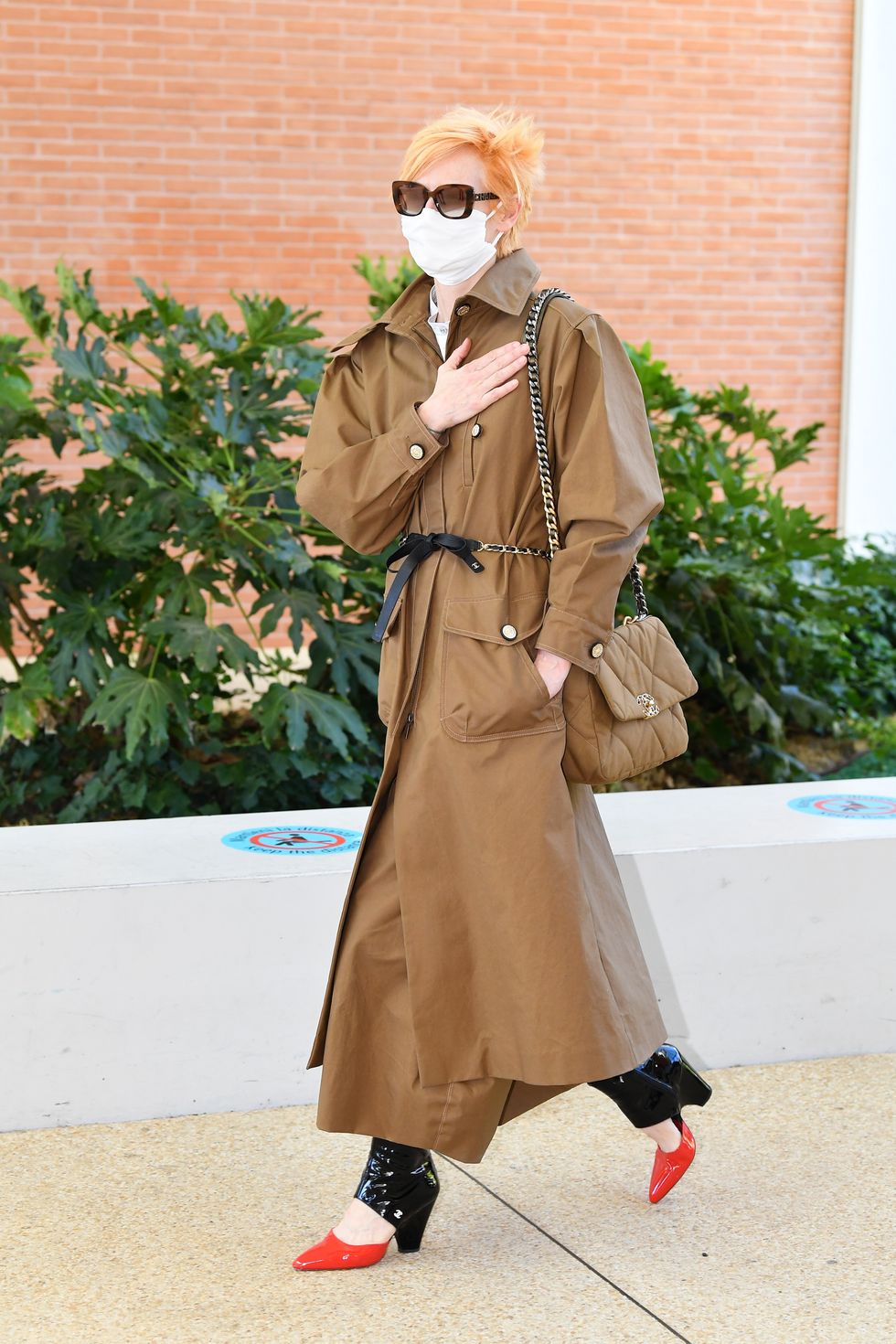 Cate Blanchett, who is this year's president of the jury for the main competition, was spotted in incognito mode with her black sunnies and tote bag from Valentino Garavani. (Her white derbies are by Clergerie.) We're not sure if the turtleneck-over-mouth look was intentional or if she left her mask at home, but somehow it still works!