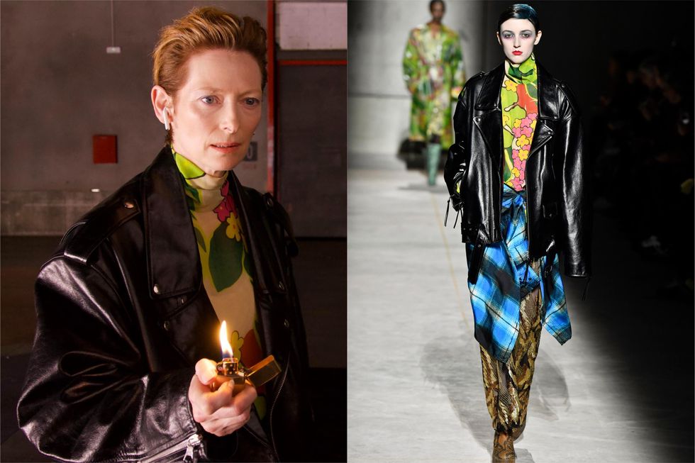 Swinton has worn her share of iconic looks both in and out of the screen. When asked about her experience with costume, she refers back to Luca Guadagnino's I Am Love and A Bigger Splash, both films in which she wore looks by Raf Simons, who worked with the costume designers to create pieces for her characters. "In both cases, this liaison was mutually fruitful" she says. "It lent a highly evolved fashion artist to create delicately expressive and integrated personal wardrobes for the portrait of one specific woman per film."