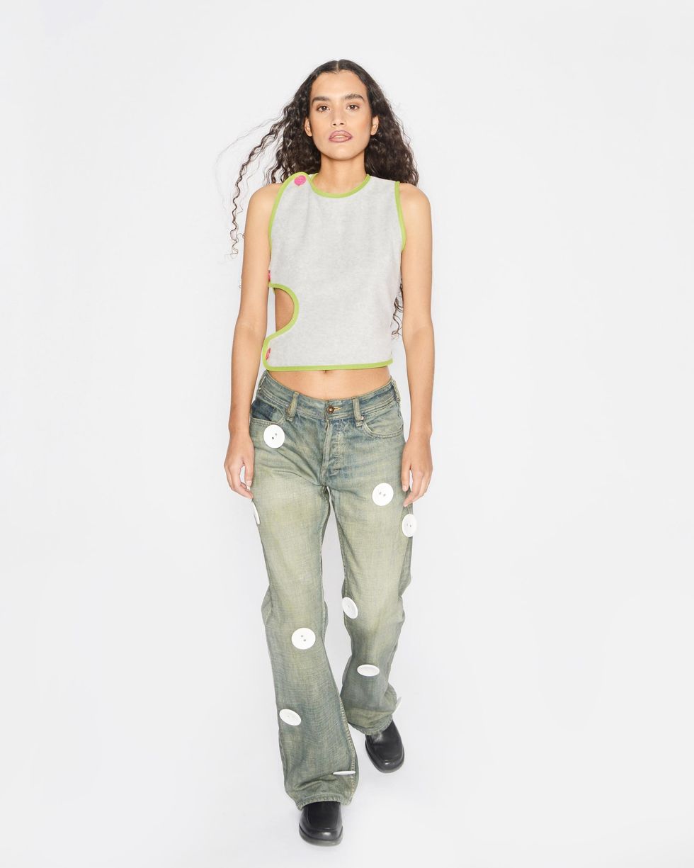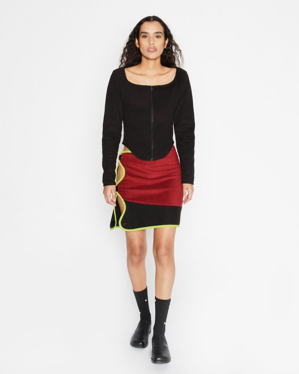 Sassen, who launched his brand by reimagining North Face fleece, started by reflecting on his own signature design elements like unusual cut-outs and exploring them in new materials. "I took core principles of the Timo Sassen brand and applied it to a fully formed 12-look collection that stays true to my fleece fantasies," he says.
