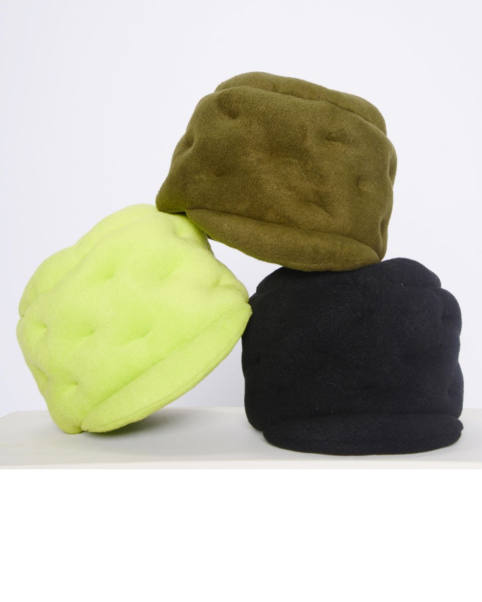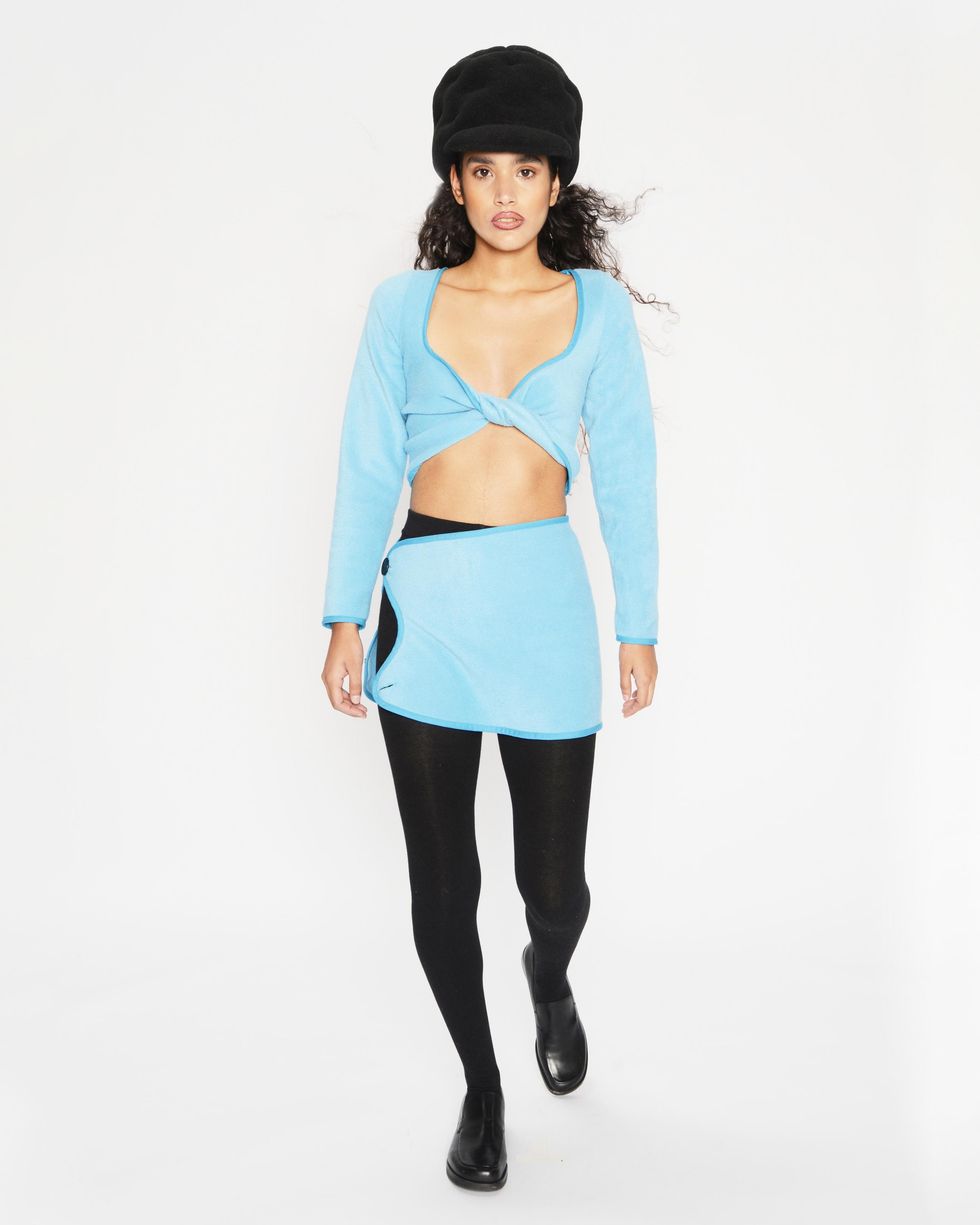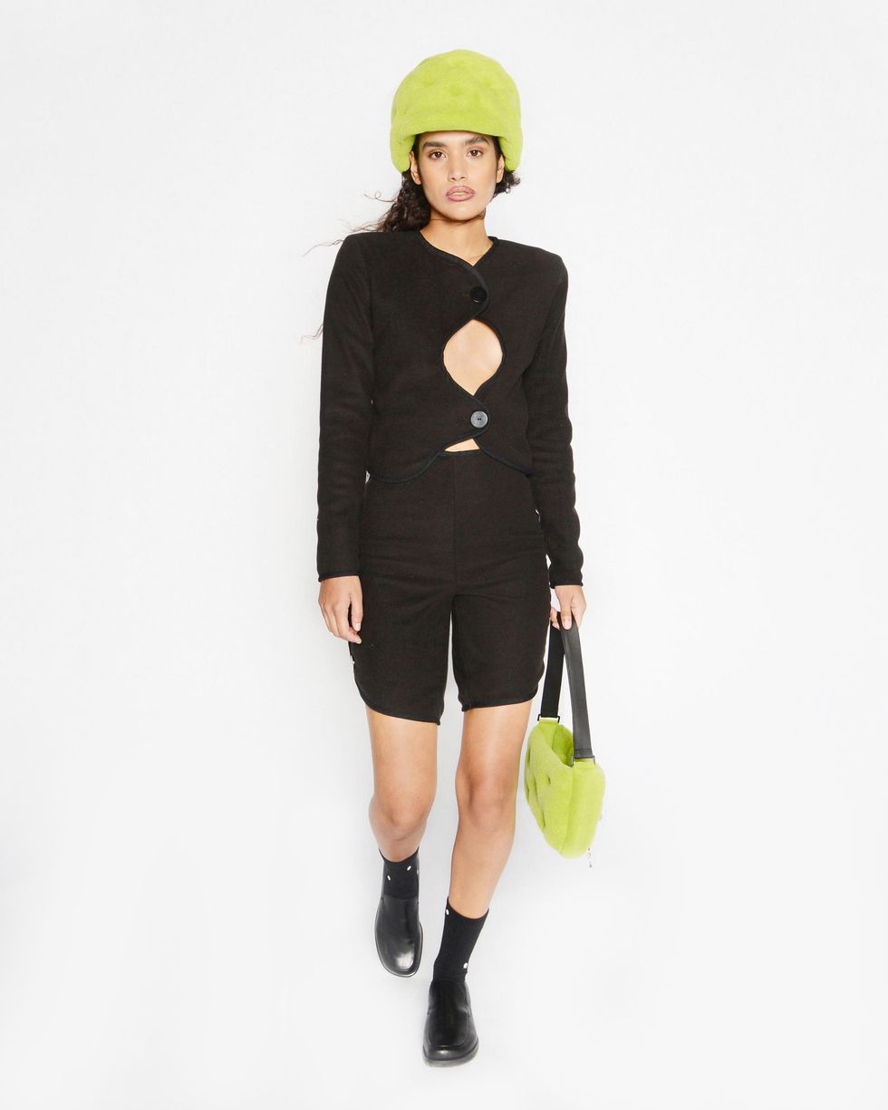 An aesthetic match, both Sassen and Columbia have explored a sense of innocence throughout their work, leaning into youthful silhouettes in "electric color combinations." Together for Fall 2021, they created a small line of hats and bags in three different shades. "There is so much emotion loaded into the materials of this collection — something we all felt this year," Sassen says. "We have to comfort ourselves in ways we know how, and for me that's fashion and fleece."