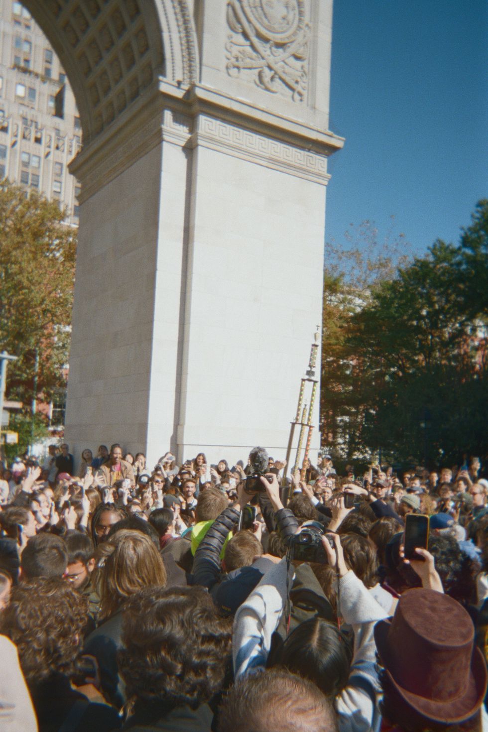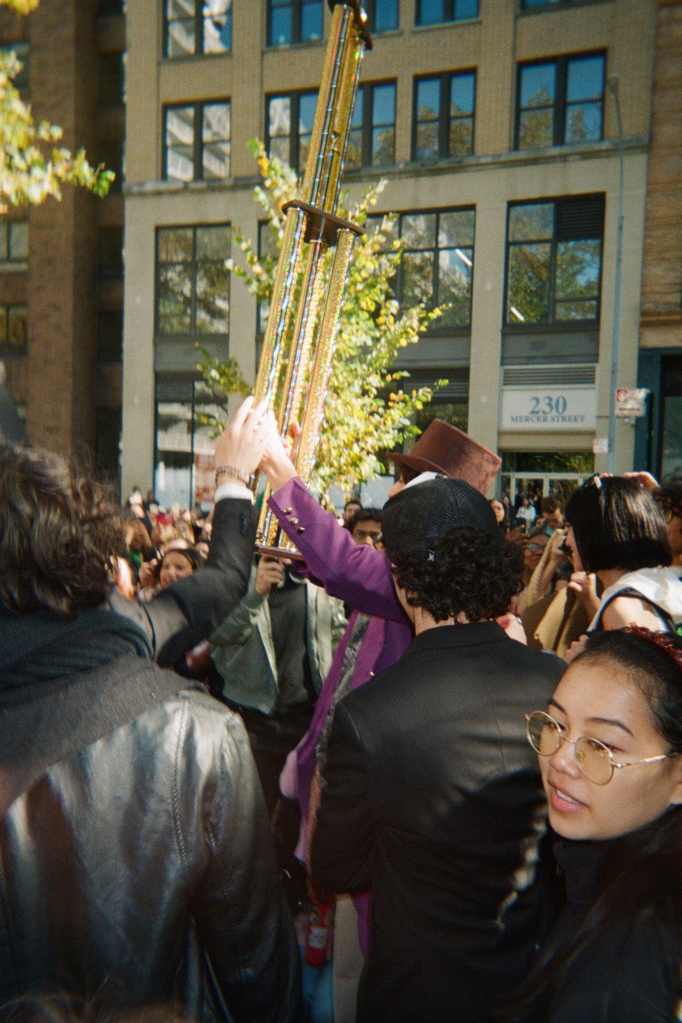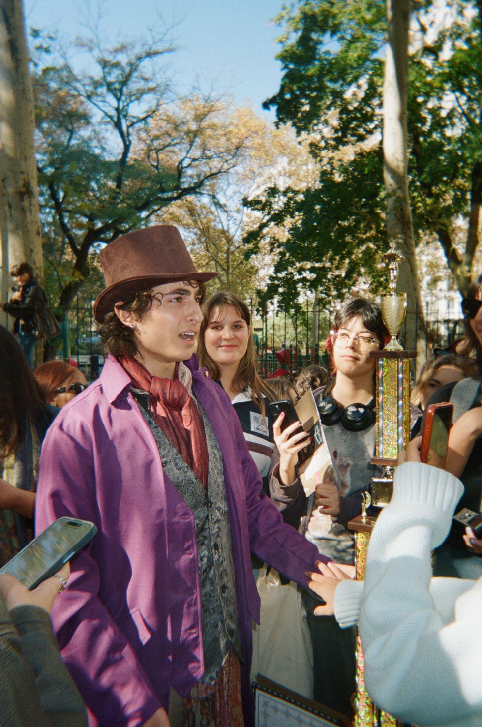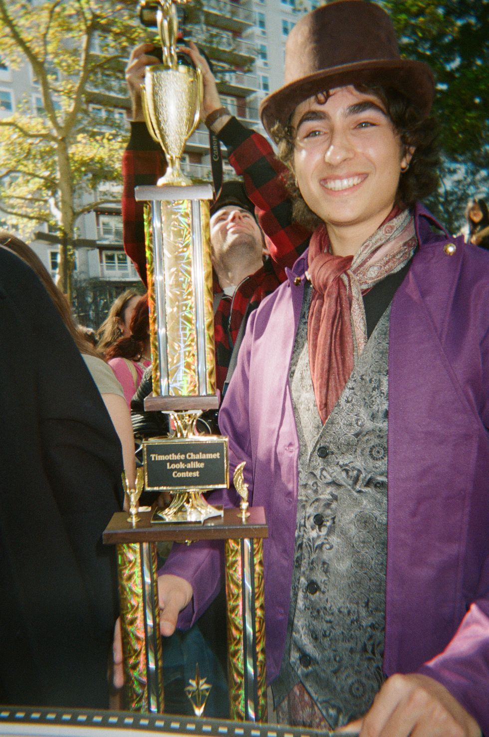 I looked up and saw the organizer of the event for the first time. A young man with piercing blue eyes, dressed in a three-piece Victorian suit and top hat – just like his avatar – carrying a six-foot trophy and leading the crowd down Waverly Place. It was a parade of Timothée Chalamets. A march, if you will. Traffic was stopped and drivers were honking. When we reached the new location, I and many others had to climb a fence just so we could see the contest.