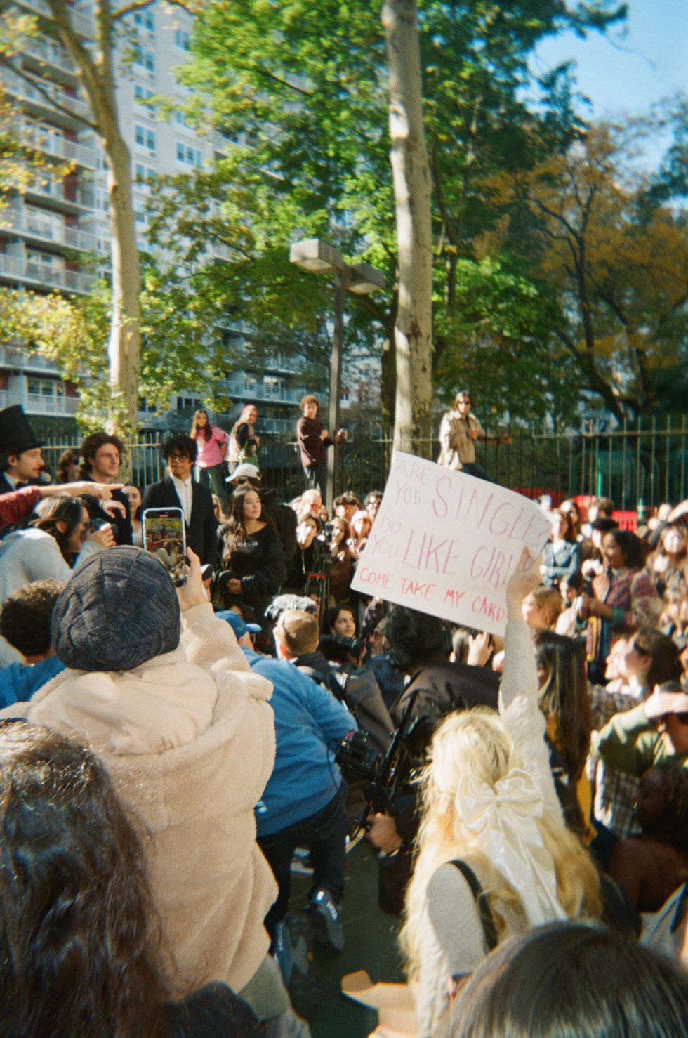 I was perched next to Matilde Pendola, a high school senior wearing a red beanie, who told me the lore of the man in the top hat. He’s a YouTube star named Anthony Po who, earlier this year, posted flyers inviting strangers to watch him eat an entire box of cheese balls in Union Square Park. So, when Pendola spotted a flyer for the Timothée Chalamet contest while taking a walk one day, she knew she had to attend out of curiosity. “I had a feeling it was going to be AnthPo,” she said.