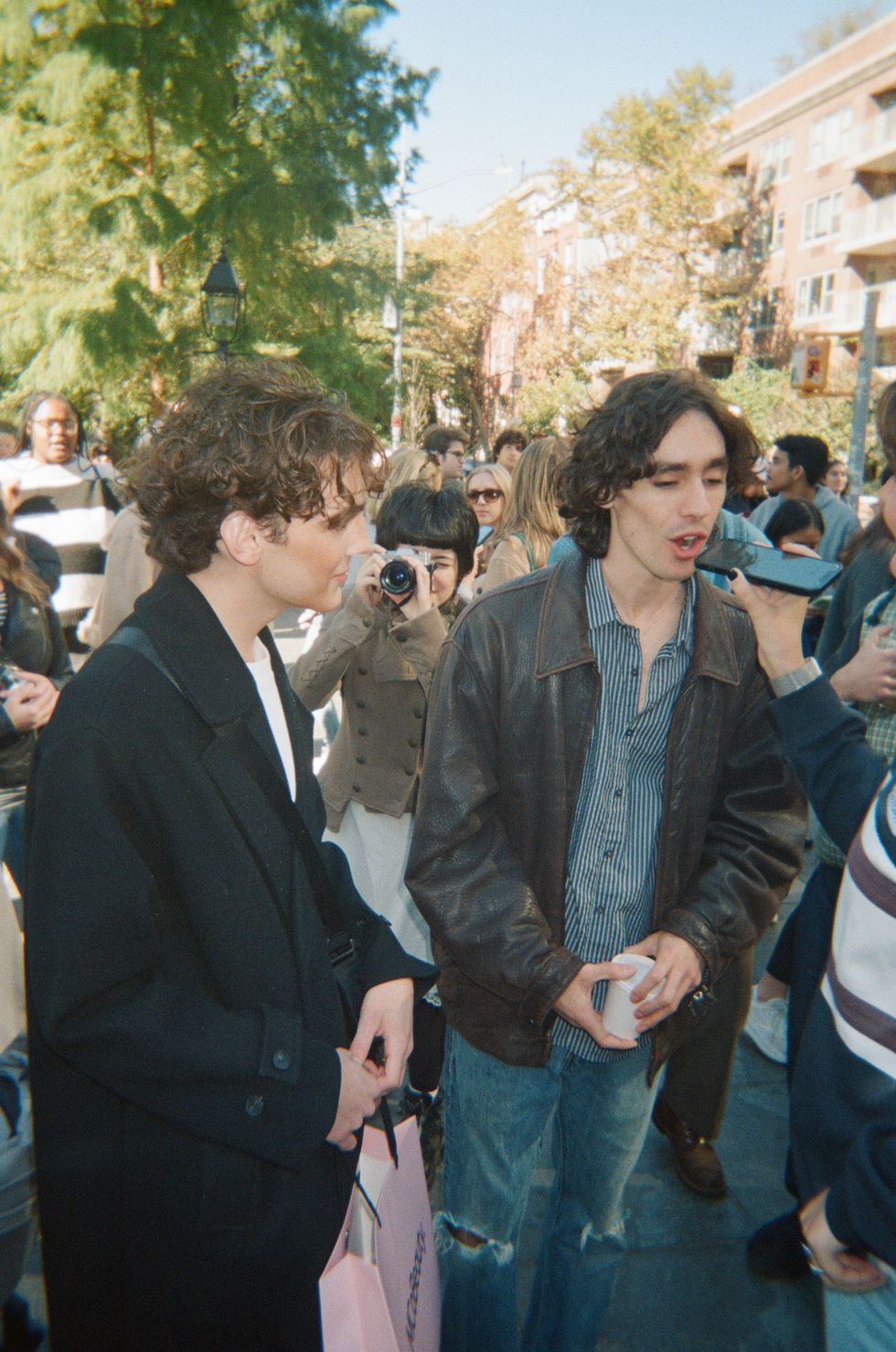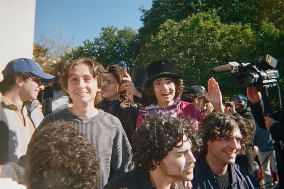 Under the marble arch, everyone gathered to see the lineup of Timothées. One of them, Jackson Garrett, wondered what the reason was for the event: “Is it a marketing ploy for his new movie? Are people gonna find love? There are a thousand reasons to come here.” Garrett had a makeup artist come to his house to help him achieve Chalamet’s look, complete with filled-in eyebrows and a contoured jawline.