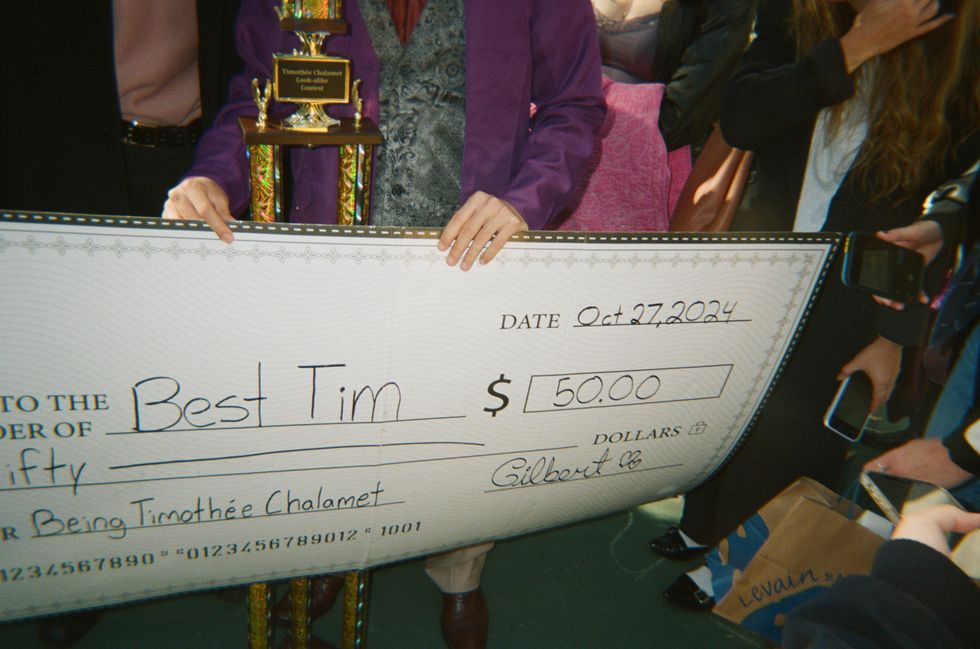 The Timothées answered questions from a panel of judges. What would you do with the $50 prize? Would you date Kylie Jenner? Say something in French. One by one, they captured hearts, and one by one, they were eliminated, until it came down to Mitchell and Dueve – Willy Wonka and Paul Atreides. They both received thunderous rounds of applause, but ultimately, it was Mitchell who took home the prize. Po handed him the six-foot trophy and a giant cardboard check for $50 made out to “Best Tim.”
