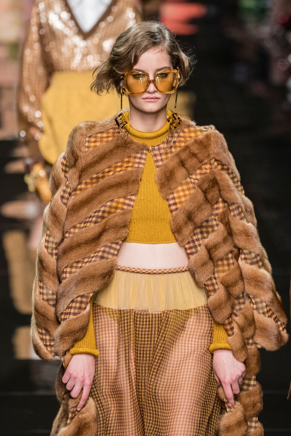 And so it's nice to see that according to Milan Fashion Week, Boardman's camp has won. Multiple Spring 2020 collections in Milan have featured ginormous Jackie O glasses, glasses that scream out for a trench coat and a silk scarf (and the presence of an unfaithful husband). Today's Fendi show — Silvia Venturini Fendi's ready-to-wear debut — was inspired by the 1968 Bette Davis film The Anniversary and the 1969 slapstick comedy Carry on Camping. If you weren't a hippie, the '60s were prime time for big, glamorous glasses, and Fendi's models were dressed accordingly, in giant square sunglasses with grandma chains. Even a newly-blonde Kendall wore a big tortoiseshell pair.