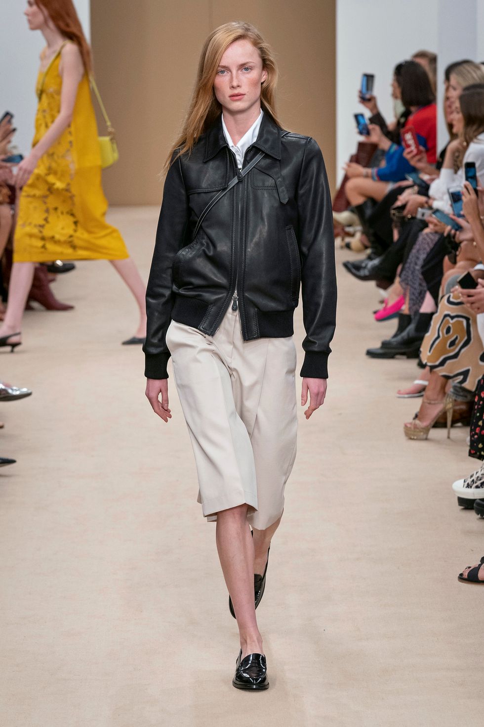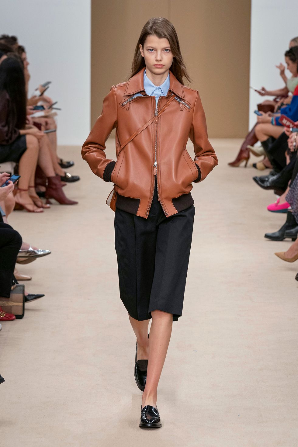 The silhouette of the season for Tod's is a fitted jacket or bomber with a pair of cool, minimal culottes that are cut rather slim and hit right at the knee.