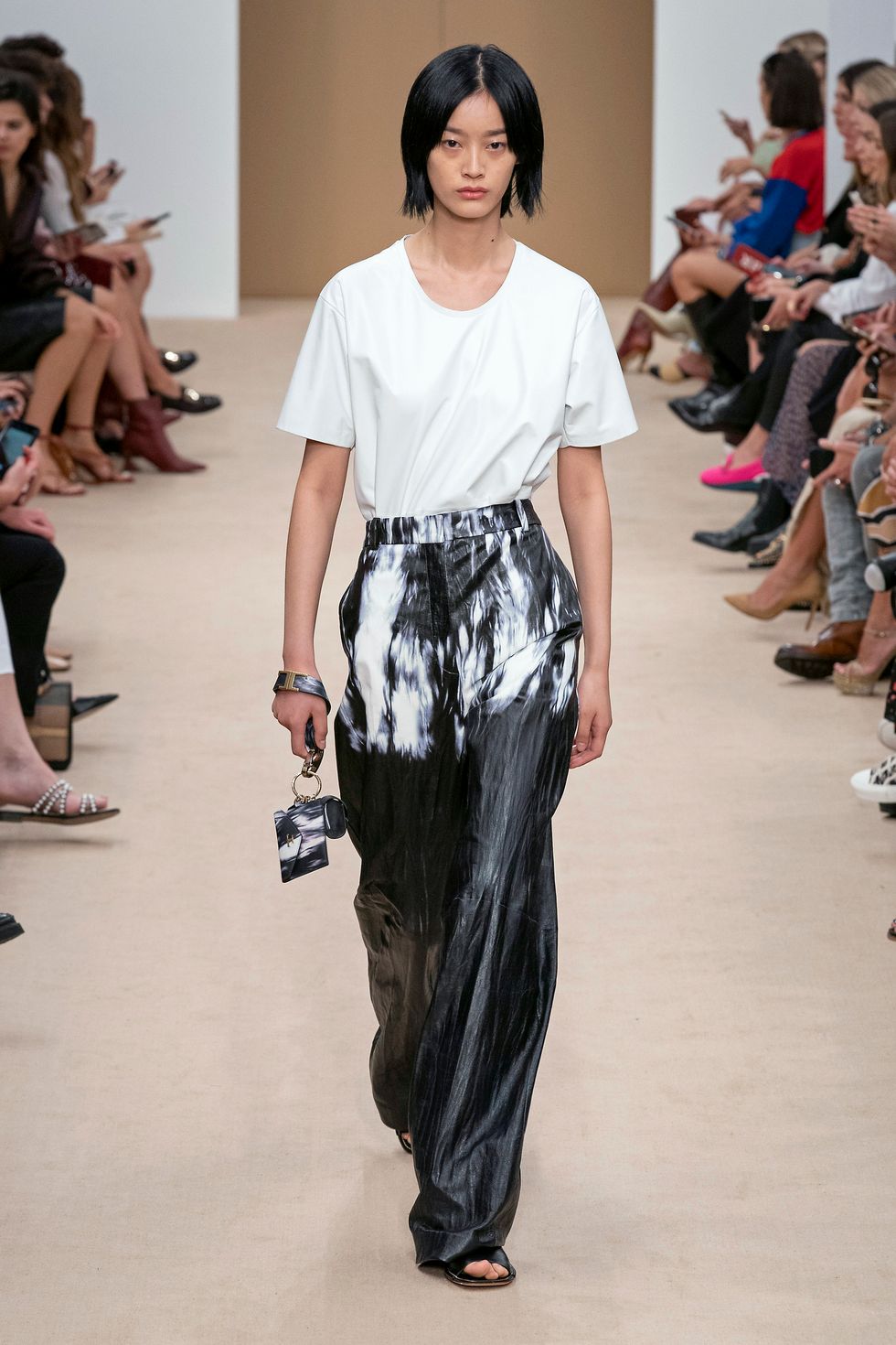 Crinkled skirts, dresses and shirts featured white tie-dyed effects in one of the few prints of the collection.