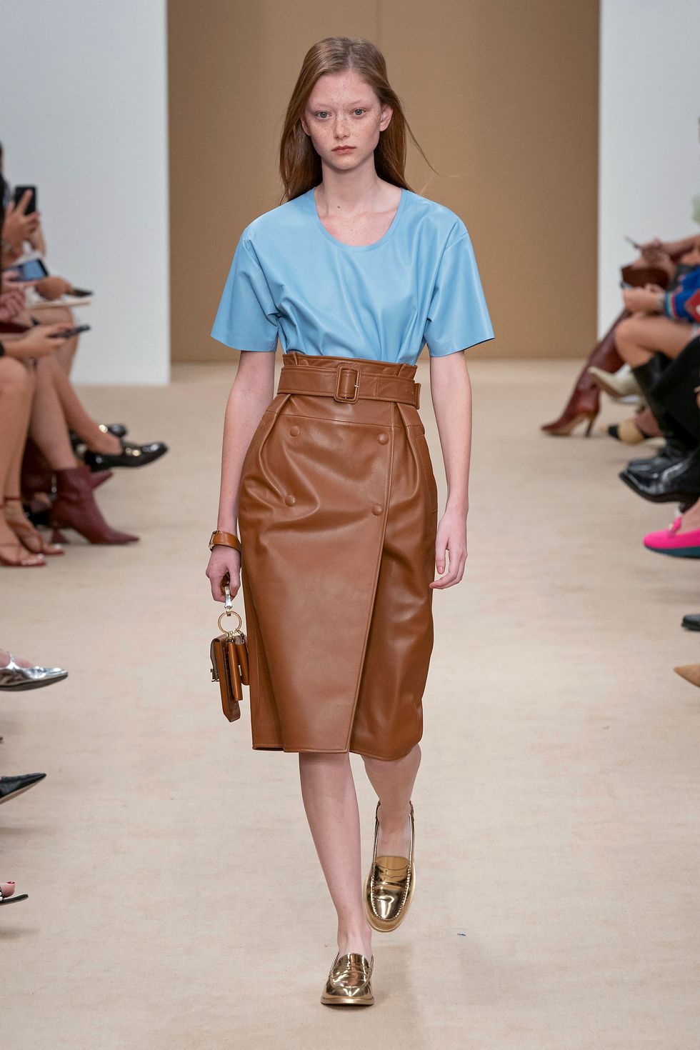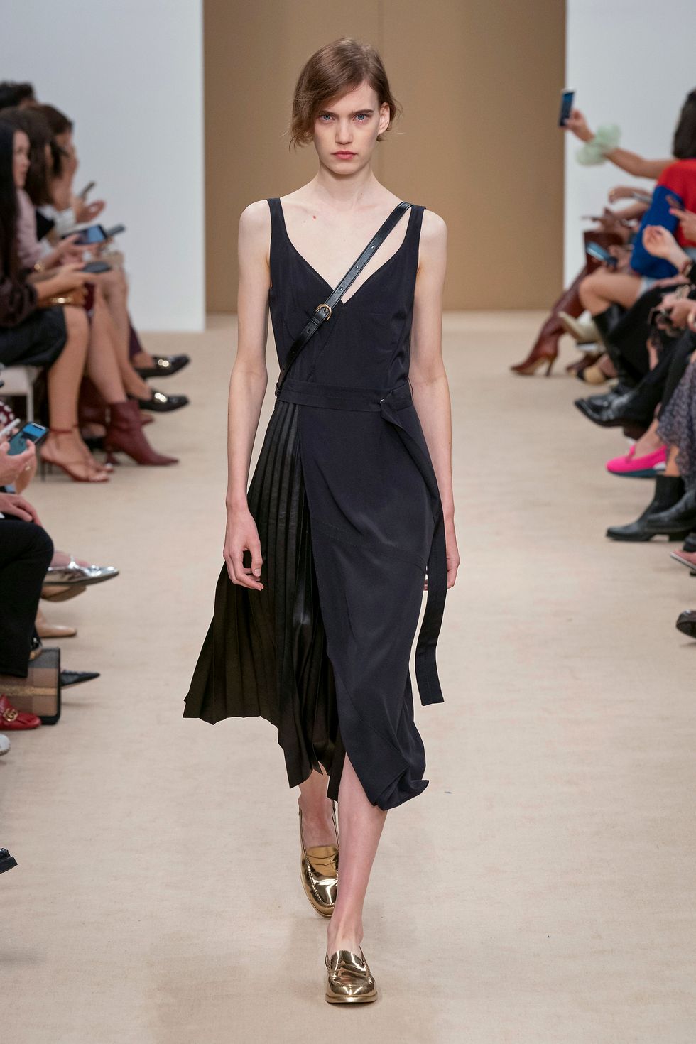 The collection's standout pieces were a series of midi dresses and skirts with asymmetrical panels of pleated leather inserted to create a contrast effect.