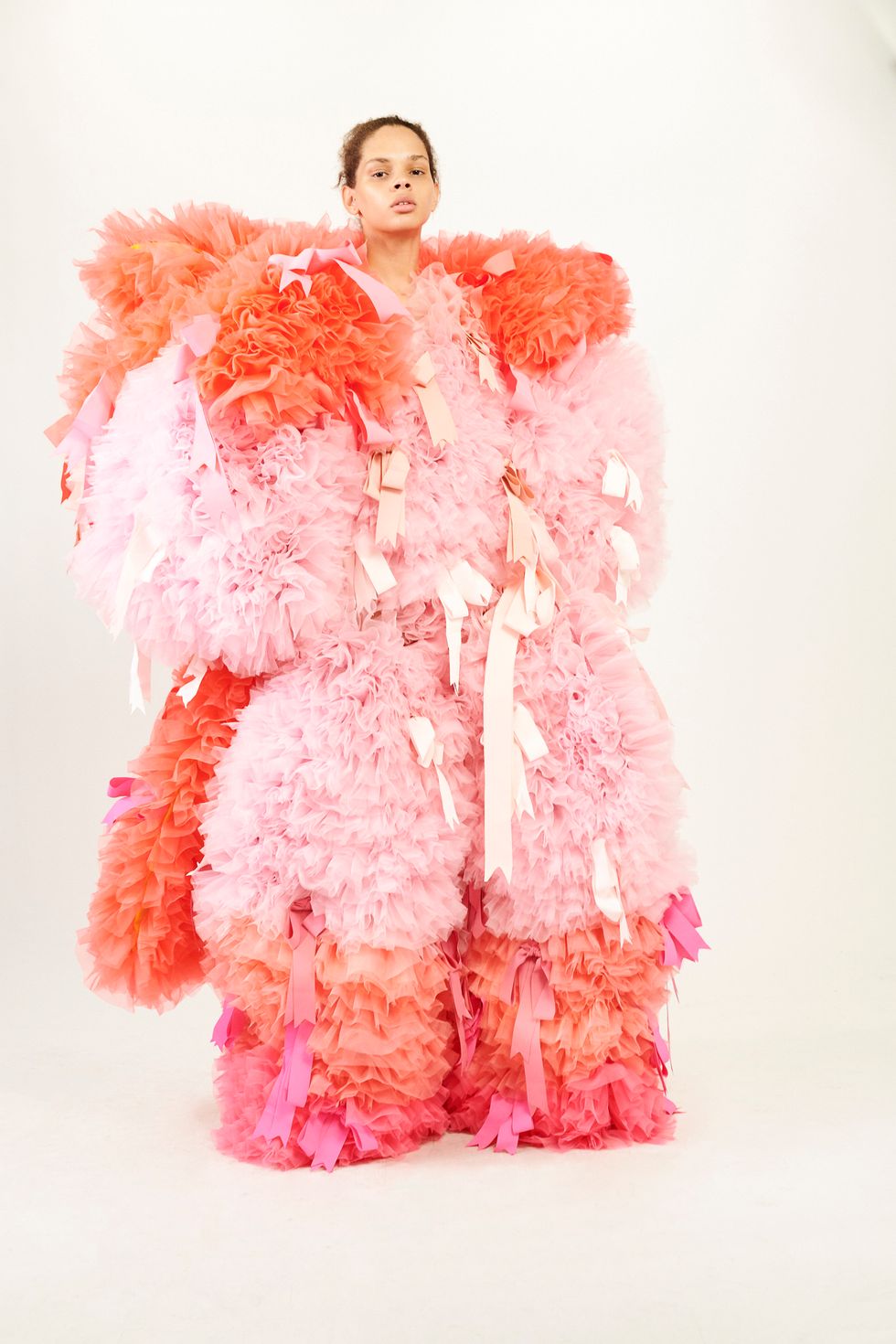Nicholson danced around the set very expressively, with exaggerating motions and dramatic gestures conveying a sense of performance art. Unlike last season's effort, there were no cocktail-length dresses here. Everything was bigger, boxier, and for a lack of a better word, more extra. The only embellishments were giant ribbons inserted throughout each look, and the colors were vibrant and imbued with a multi-toned, gradient effect. The last two looks were perhaps the most striking, with a white bridal number and black funeral costume providing a counterbalance to the rainbow of hues Koizumi has played with up till now. See below for all seven looks from his Spring 2020 lineup.