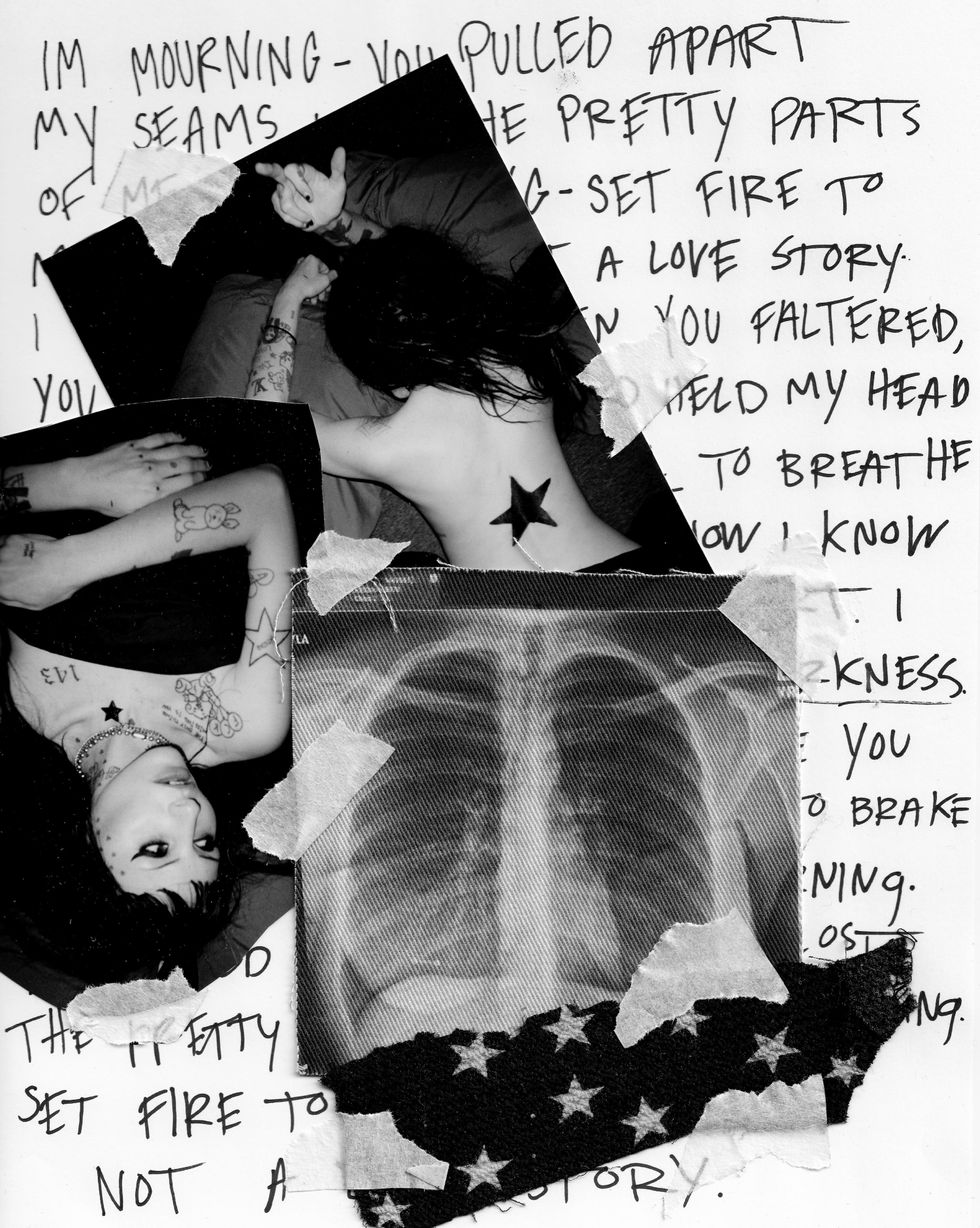 Because the song itself is so personal, TOOPOOR wanted the accompanying music video to feel just as “organic and genuine.” So she tapped her “besties to shoot it,” including PISSKISS, and edited the footage herself to create a lo-fi visual that looks voyeuristic with real diary entries running over the top of black-and-white, night vision frames.