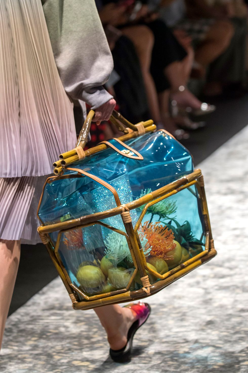 Marco de Vincenzo has been looking back on his Sicilian upbringing for the past three seasons. For spring 2019, the designer was inspired by his aunt Santina, a Californian whose mannerism, curiosity, and wardrobe perplexed locals when she visited in the southern Italian state in the 1980s. Her "trashy taste" as de Vincenzo described it, reflected in a fabulously garish, bamboo and PVC carryall filled with lemons and flowers.