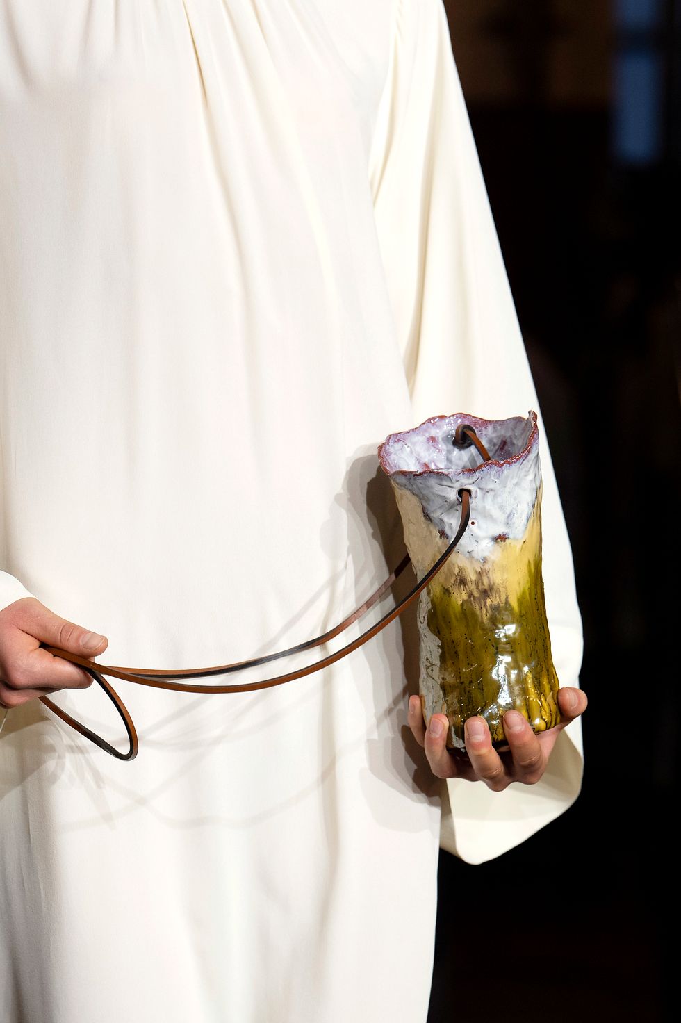 Milan-based designer Erika Cavallini took a sculptural approach to her bags this season, quite literally. Hand-formed, raku-fired vessels in rust, ocher, moss green were attached to leather straps and styled as cross-bodies and belt-bags. A limited series of these porcelain pieces, signed by Cavallini, are currently available at the designer's Via della Spiga boutique.